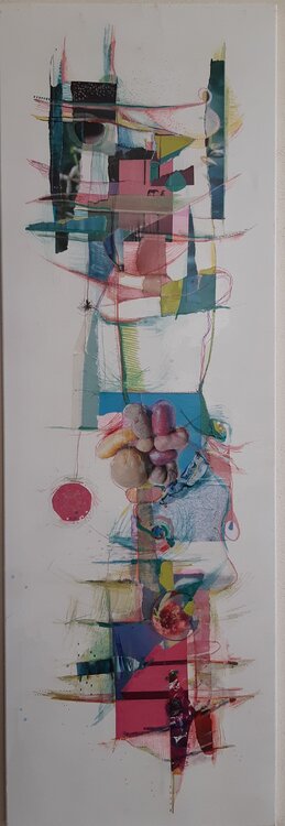 Dans la composition ludique et gourmande comme une fantaisie Culinaire, des collages sont intégrés de manière audacieuse, évoquant la joie et la gaité dans une célébration joyeuse. Cependant, ce n'est pas tout. La toile prend une tournure inattendue en incorporant des collages de pommes de terre, transformant l'ensemble en une recette de cuisine artistique qui marie fantaisie et couleurs.