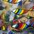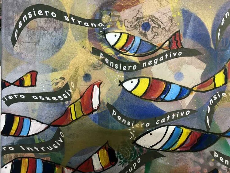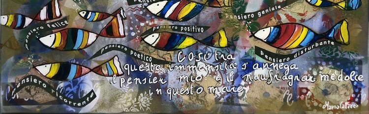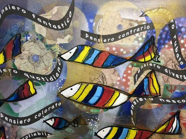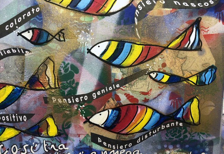 Pensées (technique mixte collage et acrylique 70x50). Mon esprit est comme un aquarium rempli de synapses colorées en forme de poissons qui tentent d'esquiver les pensées désordonnées de toutes sortes où tout et son contraire se trouvent, un flux que j'essaie ensuite de contrôler et d'ordonner dans un raisonnement. Oui, l'important est de penser avec sa propre tête, d'avoir son propre ensemble de pensées qui façonnent un caractère personnel, en essayant1