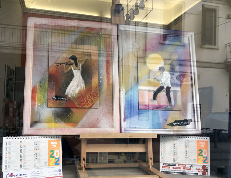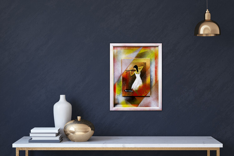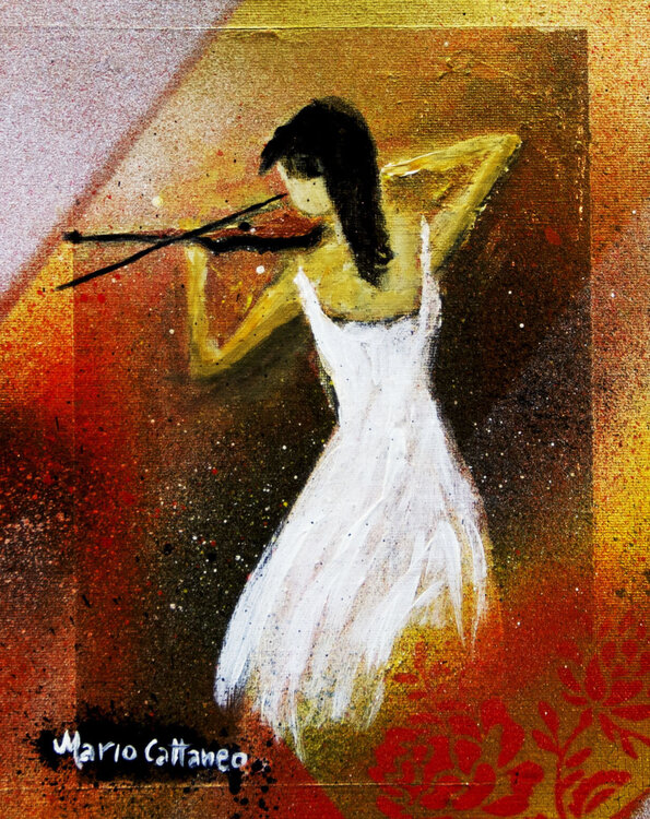 Expériences de couleur à l'aide de spray acrylique et de couleurs en tube. Le violoniste joue dans la lumière et parmi les taches colorées. Musique et couleur, quoi d'autre! ((œuvre déjà encadrée, cadre coloré à la main)