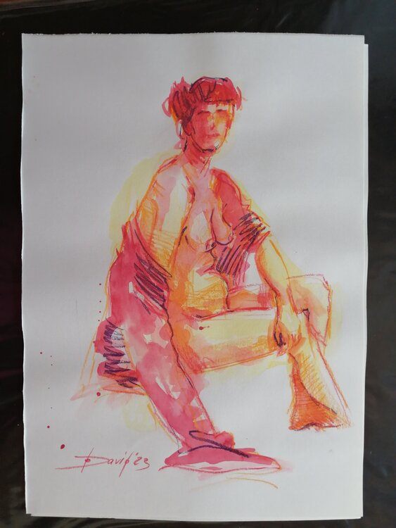 Étude de dessin de nu féminin sur papier 50x35cm. femme assise. Crayons aquarelle et pastel. Couleurs chaudes rouge, orange, jaune. art érotique Le dessin sera expédié roulé et nécessitera un cadre photo pour l'accrocher.