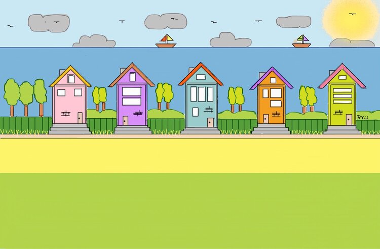 Maison de plage colorée dessinée avec la souris à la bouche (Taille de la toile 20 x 30 cm )