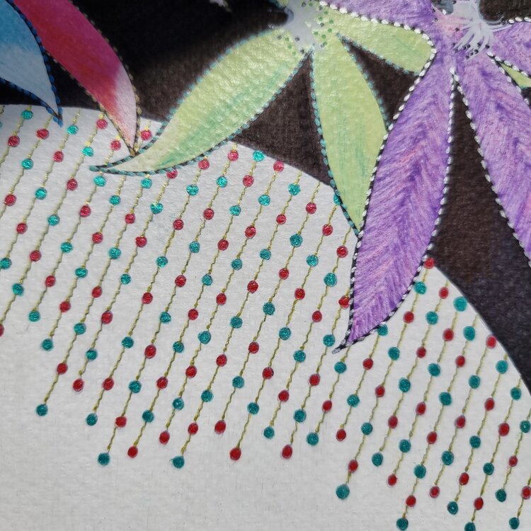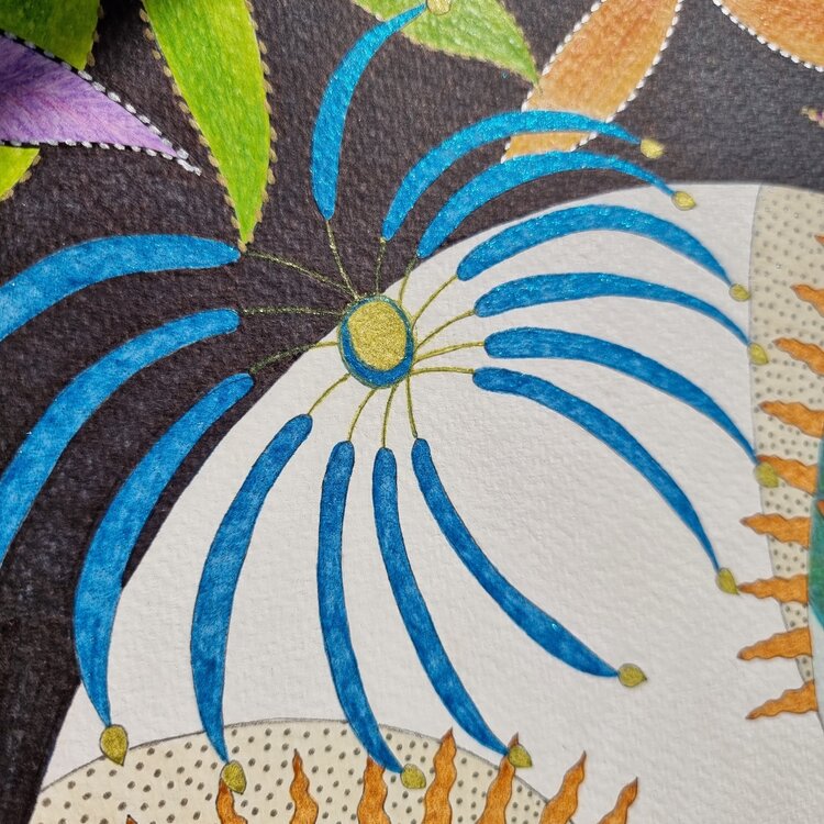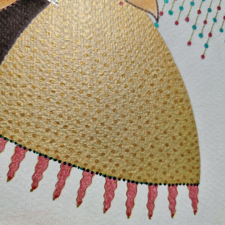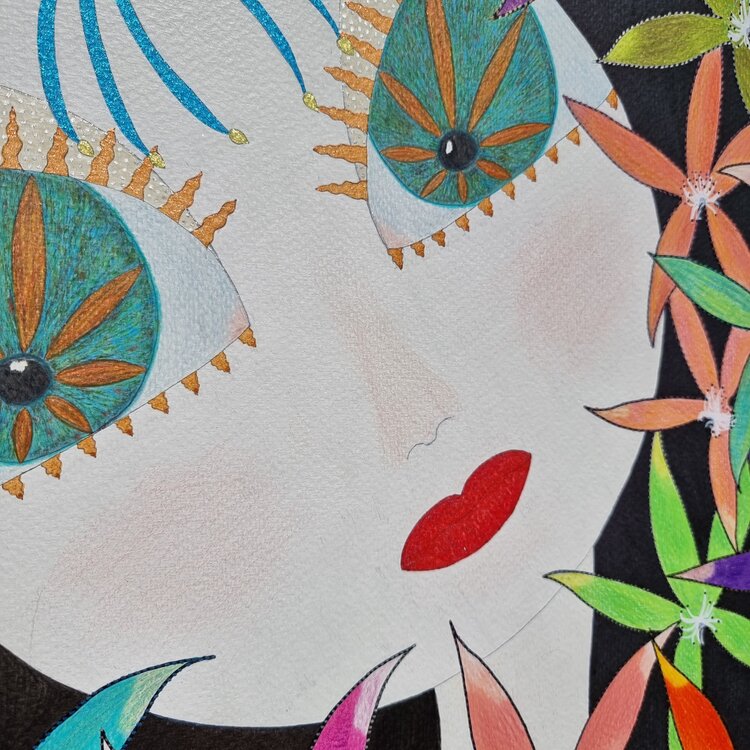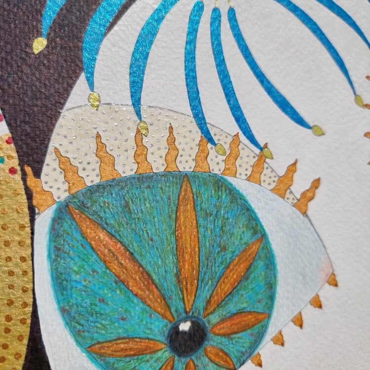 Cette œuvre aux inspirations ethniques représente deux personnages aux traits particuliers, l’un dans une figure d’apaisement et de sérénité, les yeux fermés, aux paupières dorées, ce personnage est inspiré de la culture égyptienne. Le second, les yeux grands ouverts aux inspirations aztèques. De par son regard intense on lit sur son visage de la curiosité, de la concentration. Son regard aux yeux de caméléon est un mélange de vert émeraude et de1