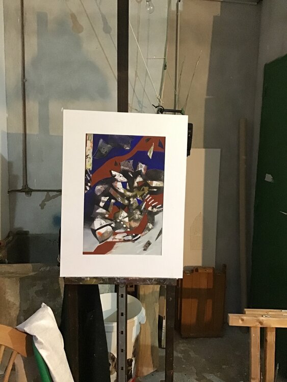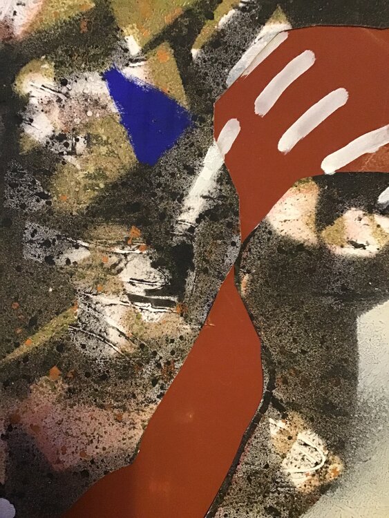 Cette oeuvre ludique réalisée sur papier card coloré couleur brun chaud , où se juxtaposent des collages ,aux formes géométriques , aux coloris bien contrastés dégage une énergie , du mouvement , de la joie