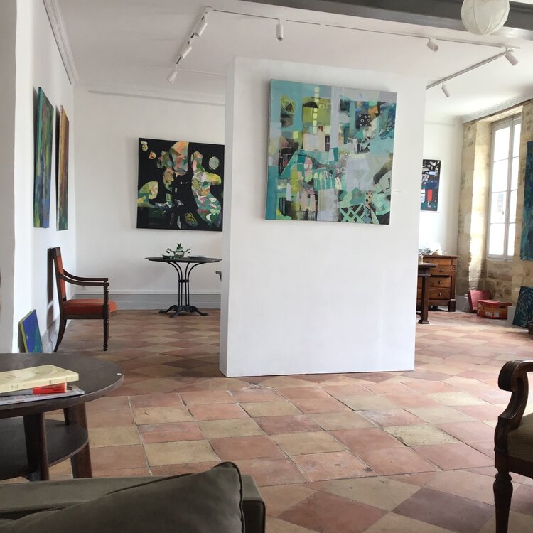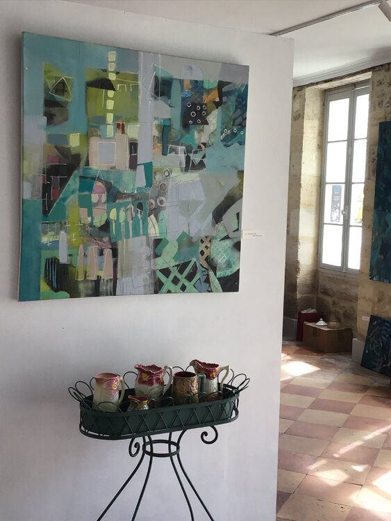 Sur cette toile de grand format carré que l’artiste affectionne particulièrement, on peut se promener dans une ville verte imaginaire . La structure géométrique adoucie par les tons pastels, de vert , de turquoise, lilas , confère à l’oeuvre beaucoup de sérénité .