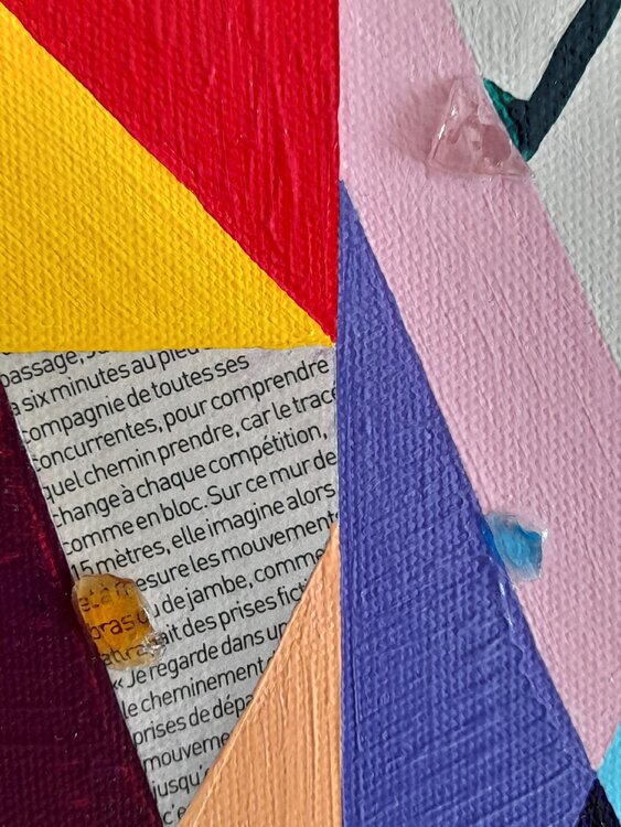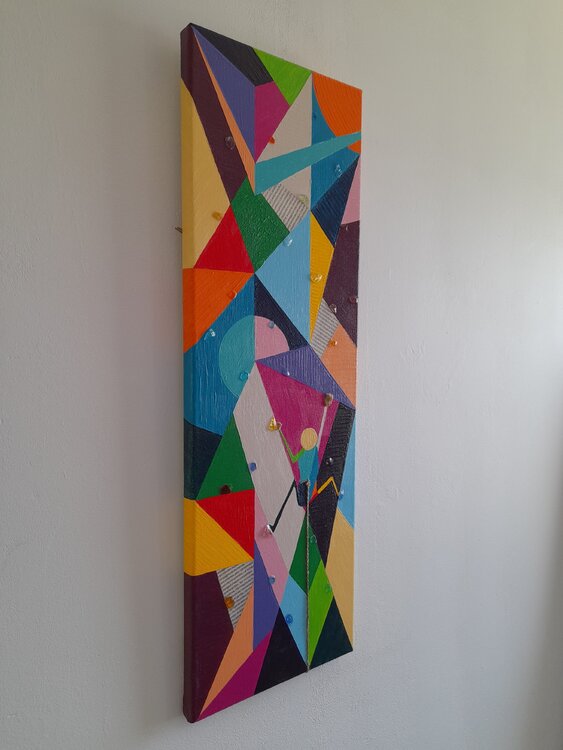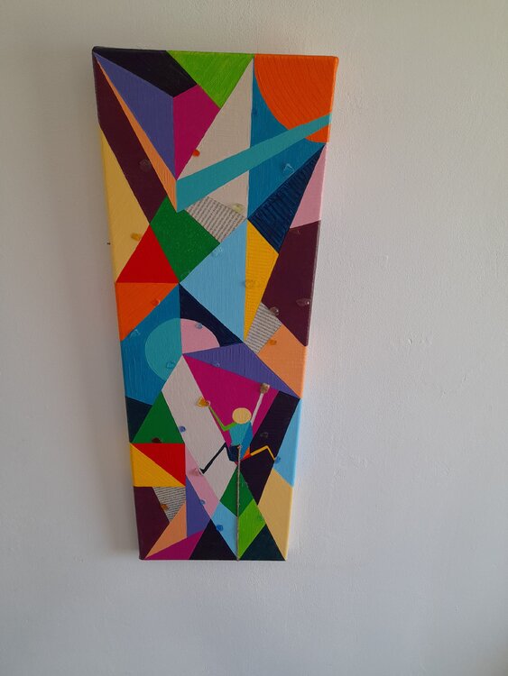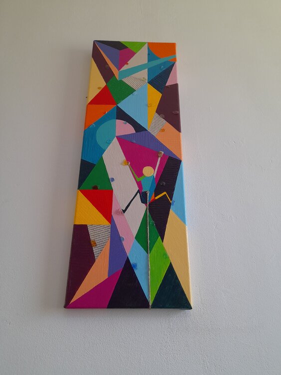 Dans cette oeuvre, l'artiste fait le parallèle entre l'athlète qui escalade la paroi et l'araignée qui se déplace avec aisance sur n'importe quelle surface. Comme pour les autres tableaux de la série, des articles, écrits dans le journal "l'équipe", tirés des derniers jeux olympiques, viennent compléter ce parallèle par des explications objectives. Ainsi, les enjeux de ce sport , ses exigences mentales et physiques sont mis en lumière par l'artiste.1