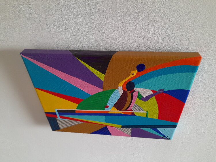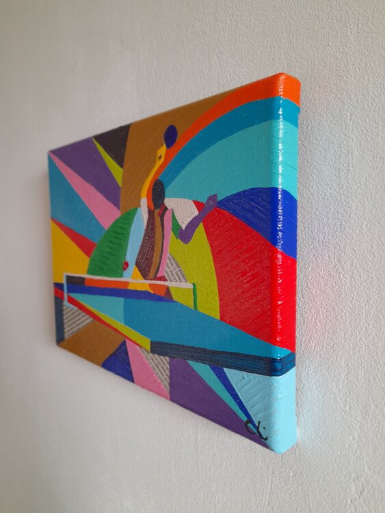 "Tennis de table" est une oeuvre dynamique qui met l'accent sur la gestuelle du pongiste. Que l'on soit amateur, pratiquant régulier ou compétiteur à très haut niveau, tous, ont, à un moment ou un autre, recherché le geste parfait permettant la victoire. Par tous, ce geste à longuement été répété. L'artiste met ici l'accent non pas sur la manière de frapper la balle mais sur l'attitude du sportif après la frappe. Il montre, ici, une autre phase de1