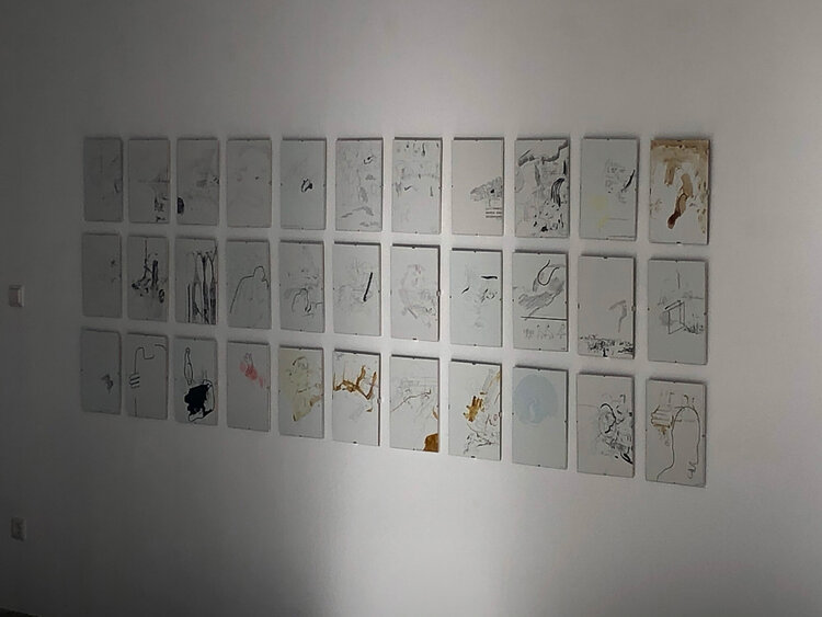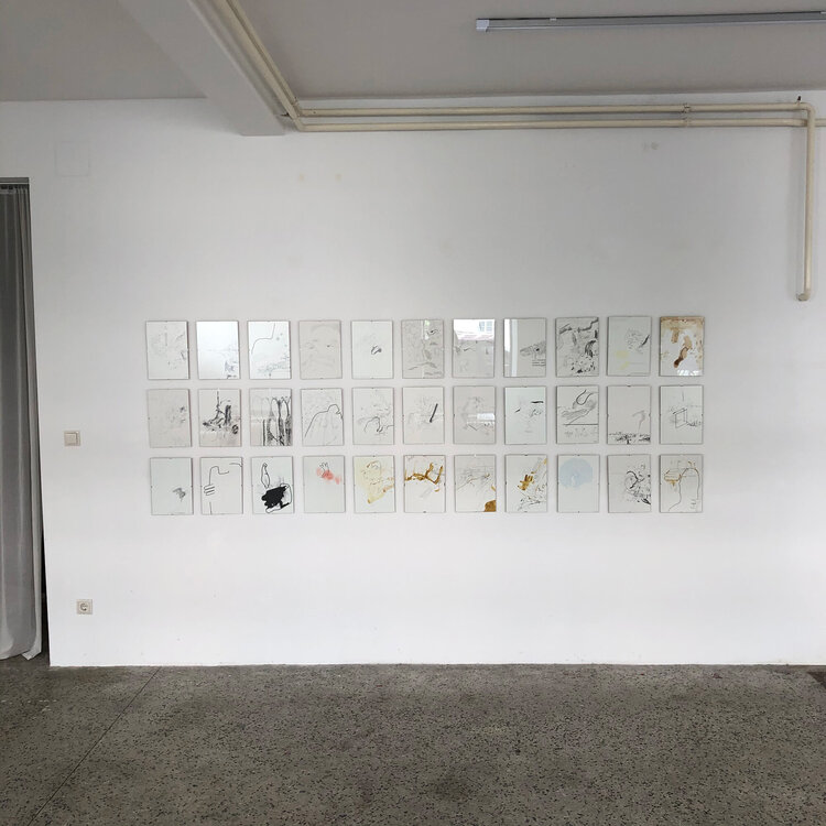 J'improvise avec mon vocabulaire formel. Et parfois, cela devient même narratif. Les mots sont des lignes et des sons et des rythmes. La phrase dans la bulle se lit comme suit : "Tout est déjà construit au bord du lac. (Le bord du lac est déjà bourré de bâtiments)"