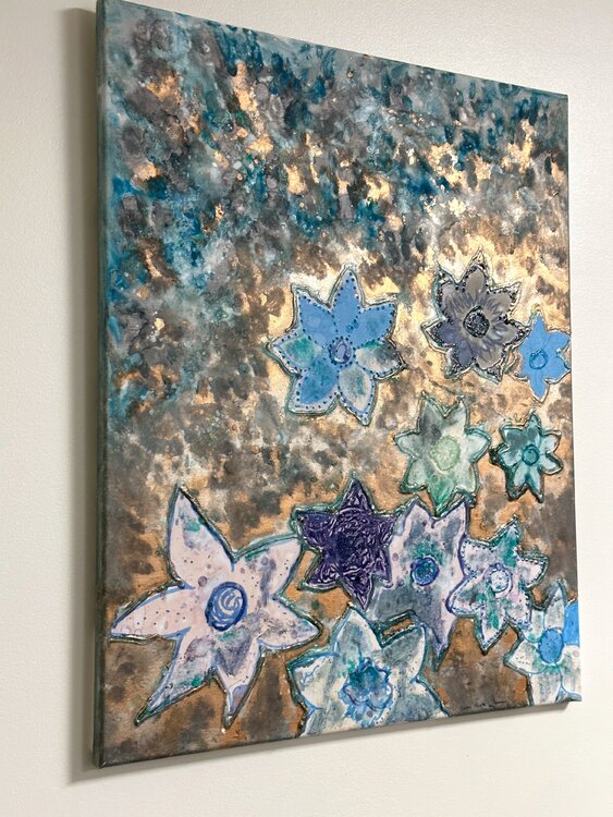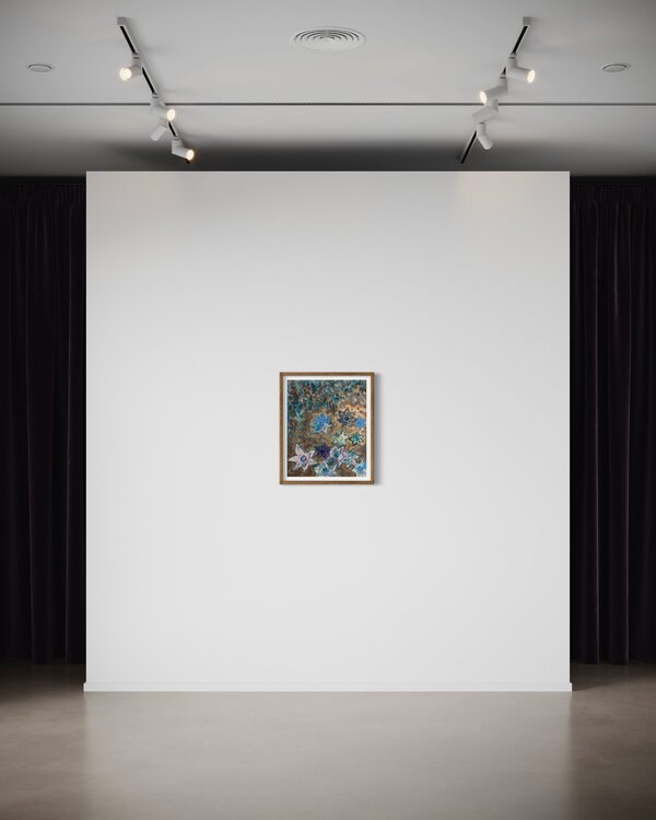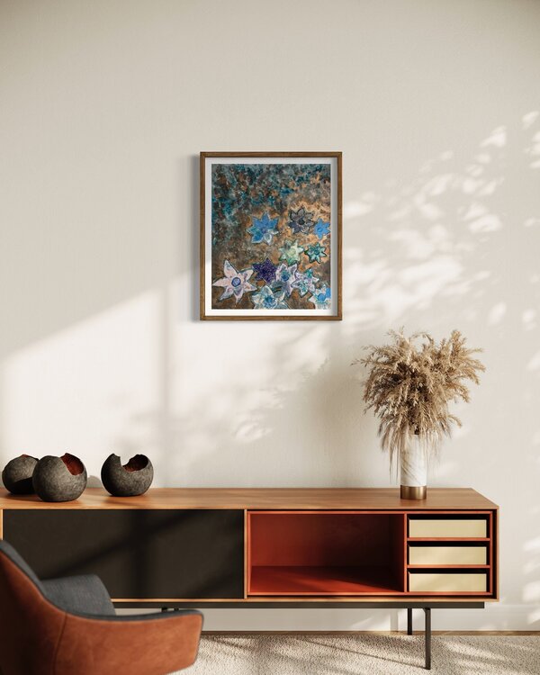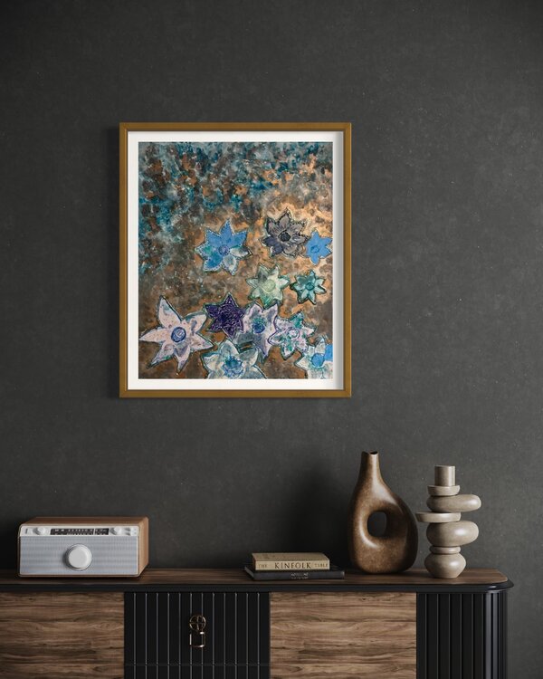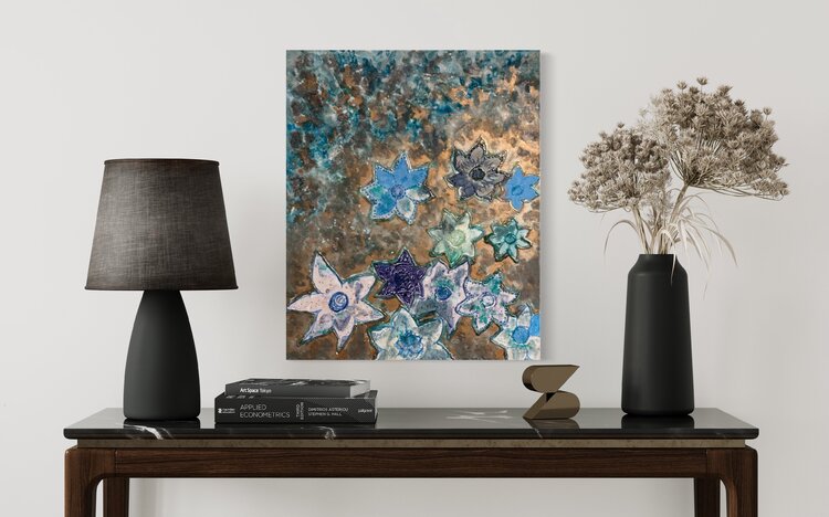 Des fleurs attractives, bleues sur fond lumineux cuivré, contrasté, qui captent le regard dans une longue contemplation et rêverie..