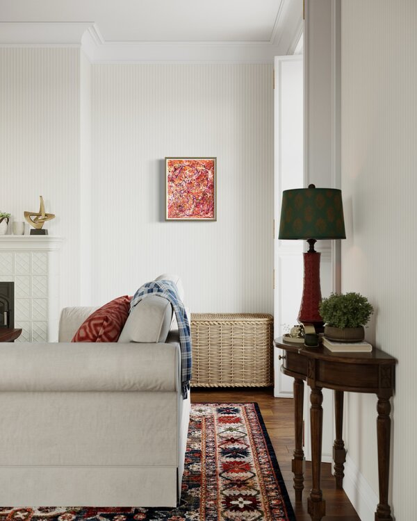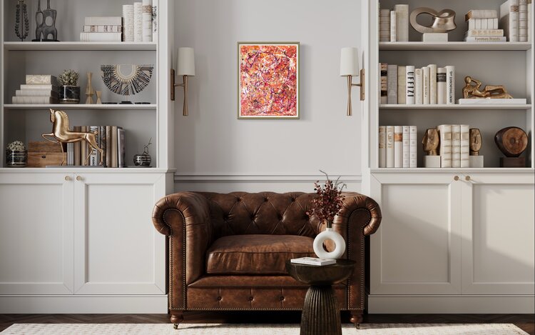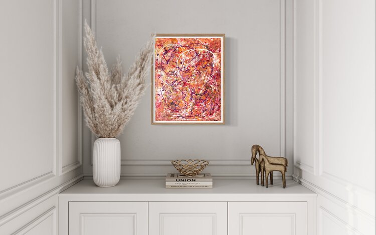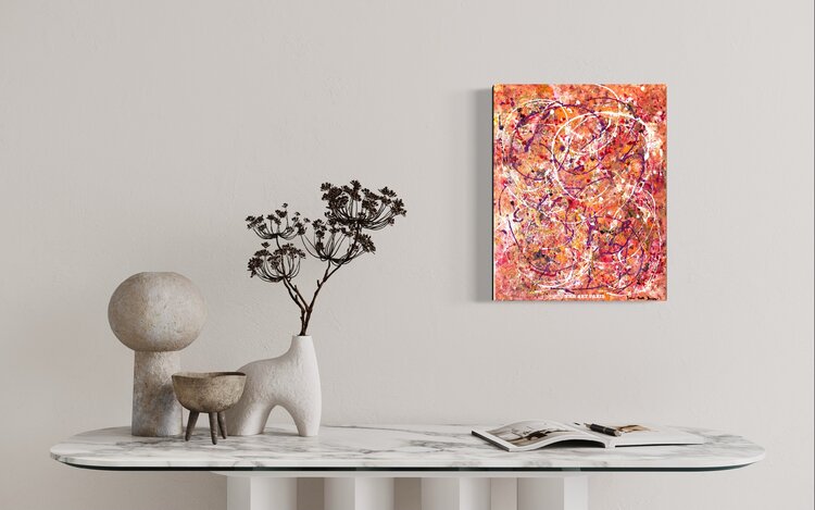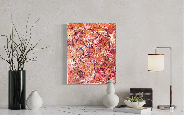 Une envolée gaie et dynamique de spirales lumineuses sur fond d’or orangé.