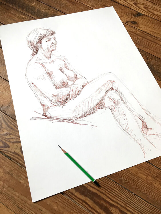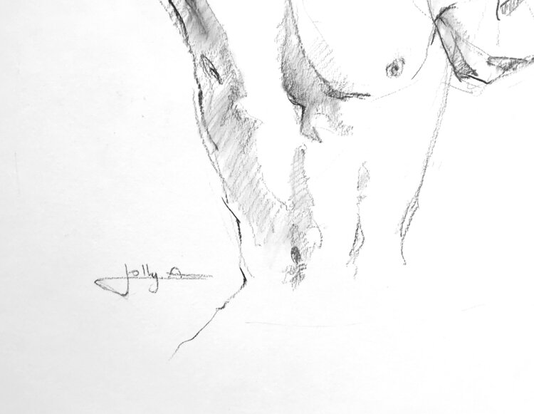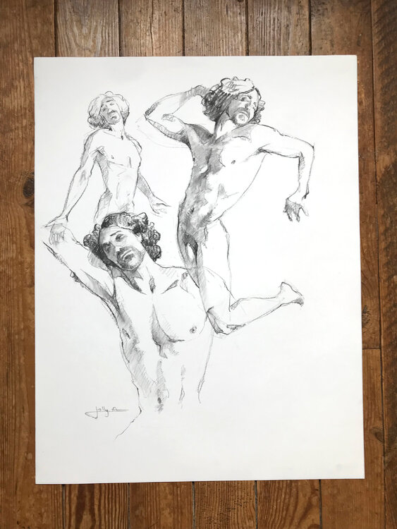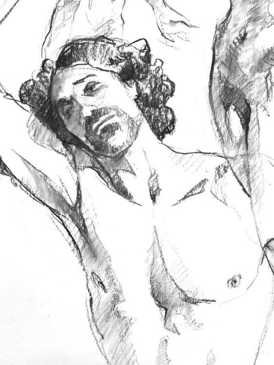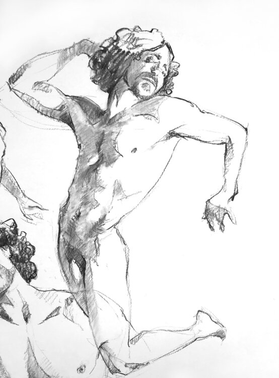 Schizzi da un modello dal vivo a carboncino naturale su carta Canson bianca. Pose da 10 a 20 minuti sul tema del Satiro Danzante, ispirate a opere della statuaria antica, come il Fauno Danzante di Pompei.