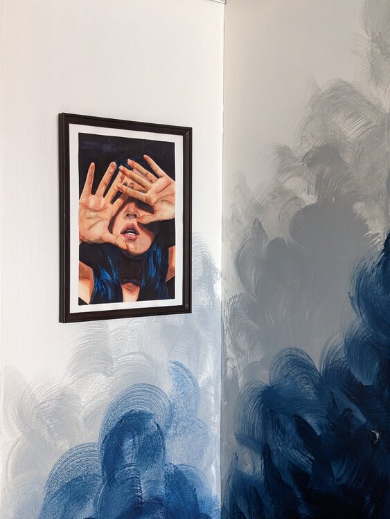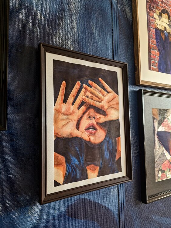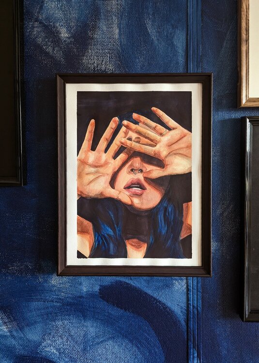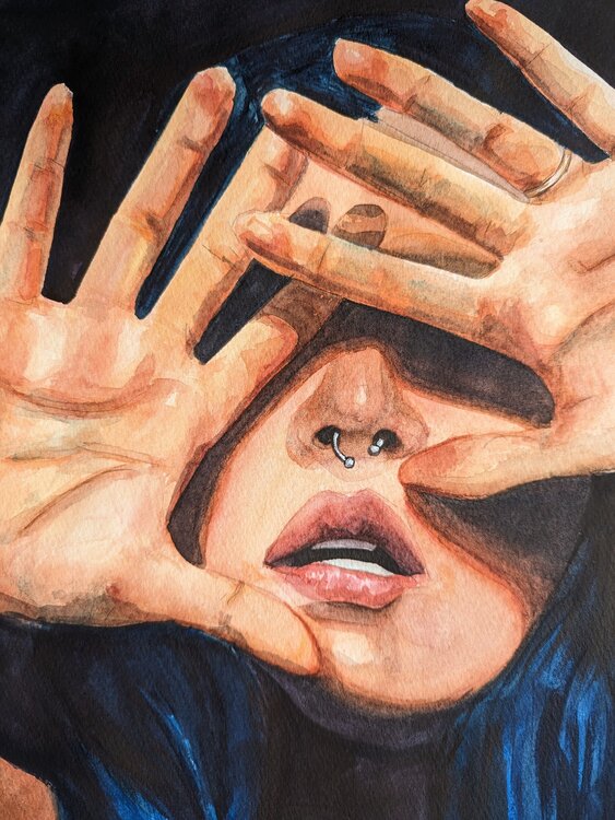 Dalla serie "Mezze parole", questo ritratto è un acquerello in stile chiaroscuro di una giovane donna abbagliata dalla luce.