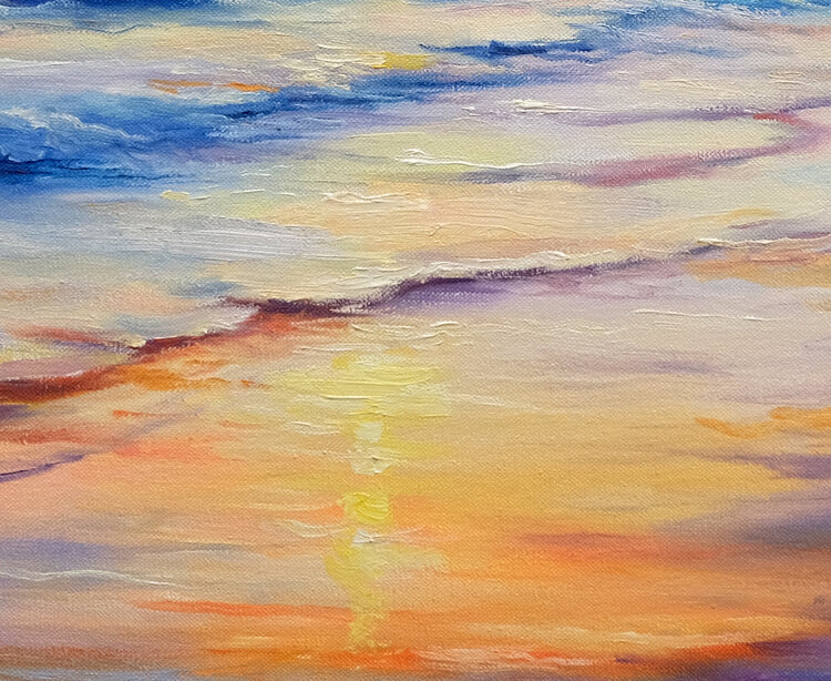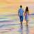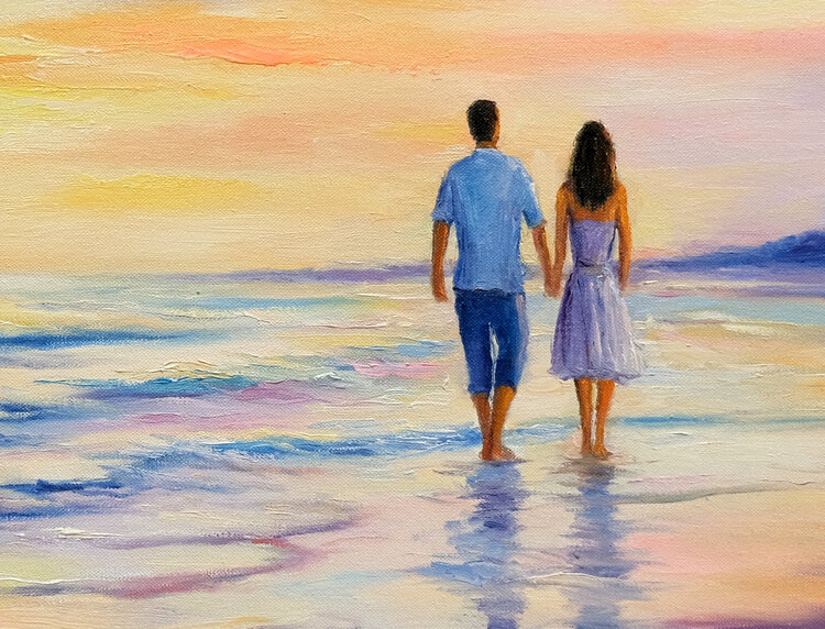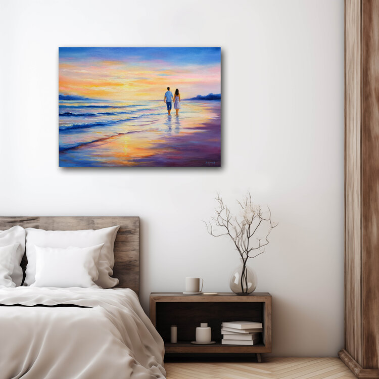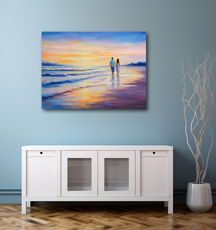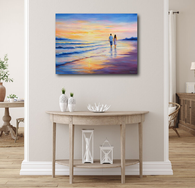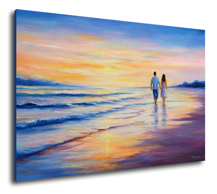 Dipinto ad olio originale pieno di luce, tonalità di colore e passione. Un dipinto appassionato che cattura un tramonto sul mare con una coppia che cammina sulla spiaggia.