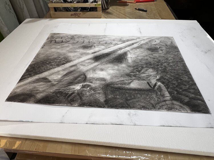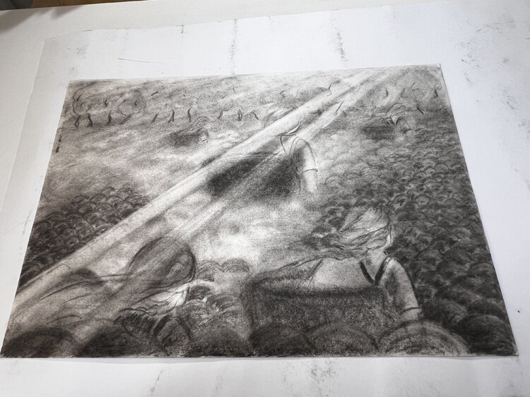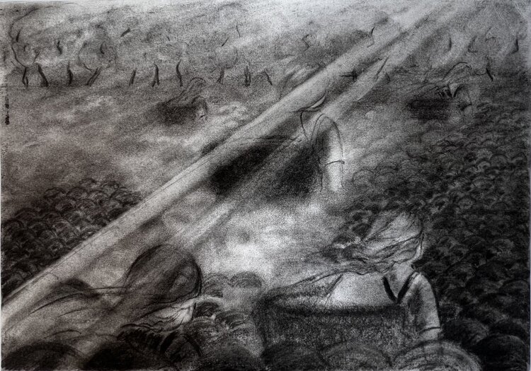 Sette opere della collezione "Battaglia delle spezie" sono difatti realizzate con la tecnica bianco e nero a carboncino; "Raccoglitrici di pepe nero", "Cammello", "Una sosta nel deserto", "Tuareg", "Per amore di un garofano", "Via nel deserto".