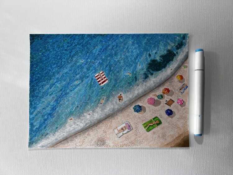 "Tropea Beach" (come tutte in questa serie) è stata creata con marker. è uno strumento moderno e innovativo con un ricco schema di colori e tinte. I paesaggi particolarmente marini realizzati con marker sono belli, trasmettono una varietà di colori e sfumature impressionanti. Qualsiasi turista che va in vacanze sulle spiagge di Tropea riconoscerà questo posto.