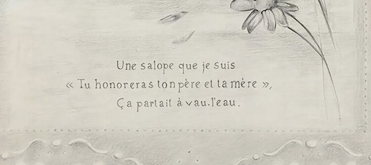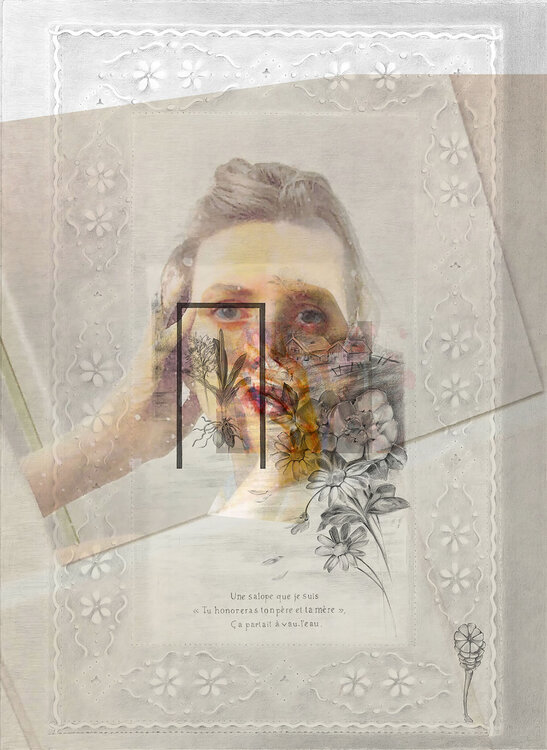 Questa stampa è un mix tra un autoritratto dell'artista, un disegno realizzato nel 2017 "Smettila di essere nunuche! (ispirato alle vecchie carte del catechismo) scansionato e dipinto in bianco e nero e vecchi quadri. Attraverso questo lavoro, Eva ha voluto trascrivere un grido, un grido vuoto, un grido sordo di fronte alla violenza morale, fisica, sessuale e sociale inflitta1