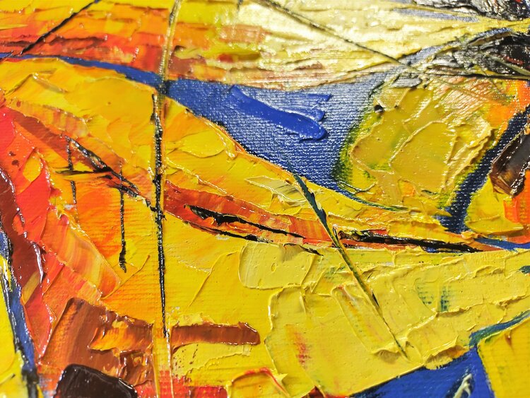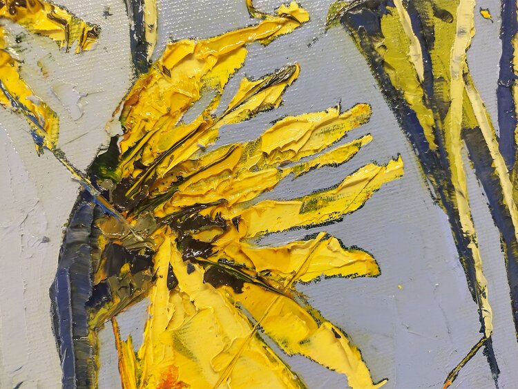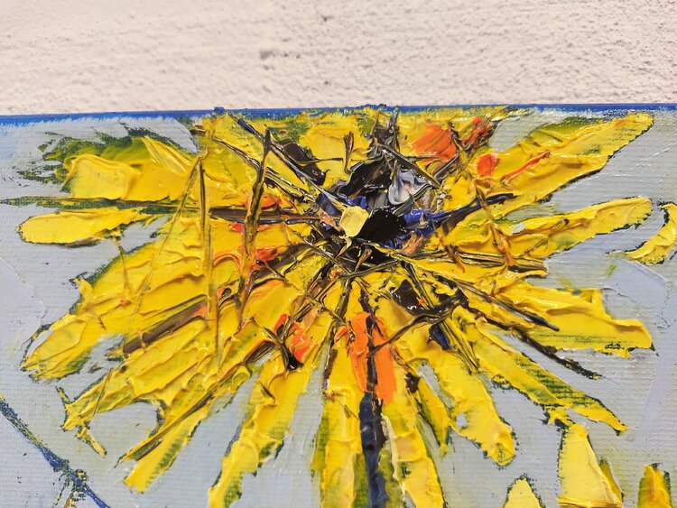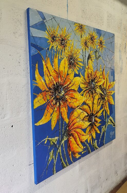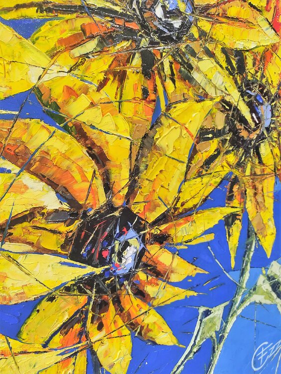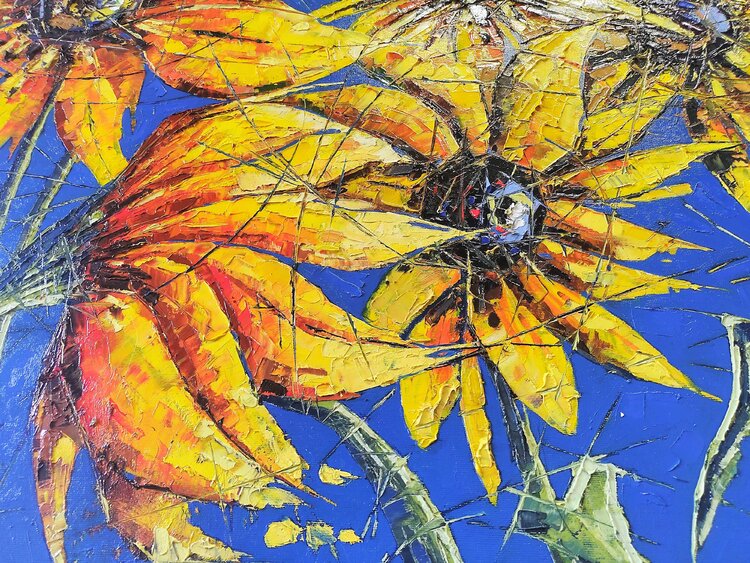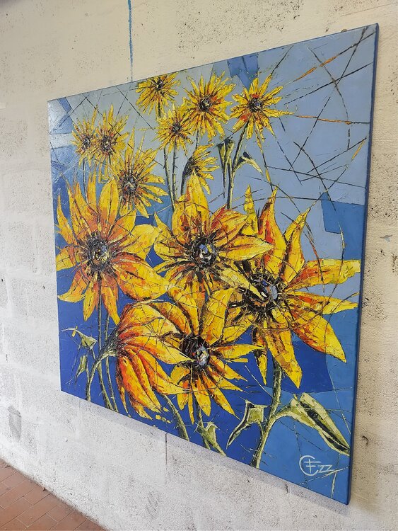 Opera eseguita ad olio e spatola. I girasoli, riprodotti in stile semi astratto, rappresentano corpi ed anime. Attraverso un insieme di linee spezzate, presenti su tutta la superficie della composizione, queste linee hanno la funzione di unire e dividere allo stesso tempo corpi e anime.