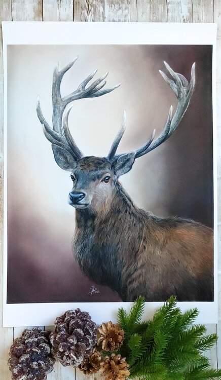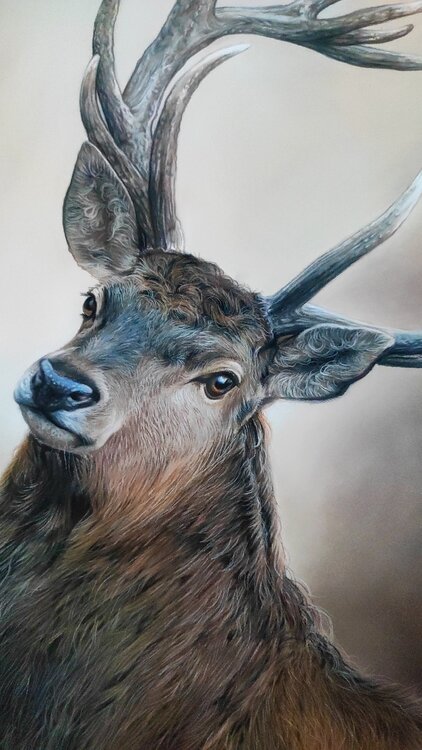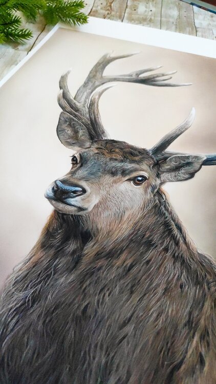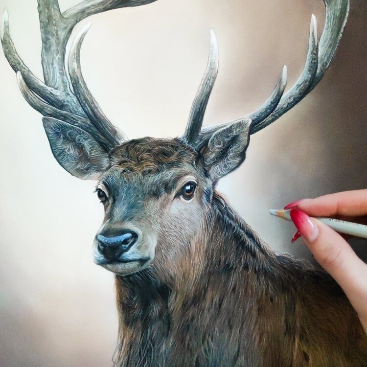 Un bellissimo cervo disegnato con matite pastello. Ida Llolluni ha realizzato con cura ogni dettaglio per catturare la grazia e la forza di questo maestoso animale. La pelliccia è stata disegnata pelo per pelo e impressiona ogni spettatore che vede quest'opera con i propri occhi.