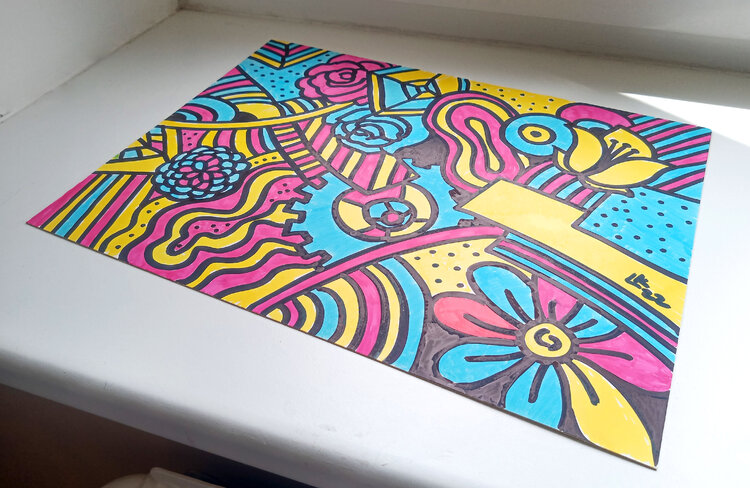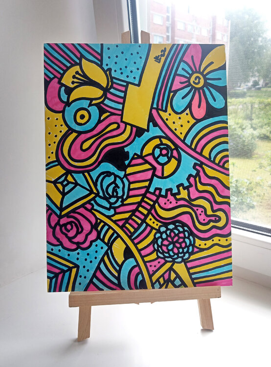 Opera decorativa astratta con fiori ricchi di contrasti e dettagli che decoreranno al meglio la tua parete. Subconscio astratto, scarabocchio, doodleart, disegno, dipinto a mano, arte dei graffiti, arte grafica, opere d'arte originali. Dipinto unico nel suo genere, arredamento della camera dei bambini, gatti, animali domestici, animali, puzzle.