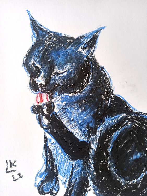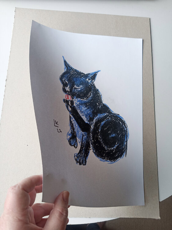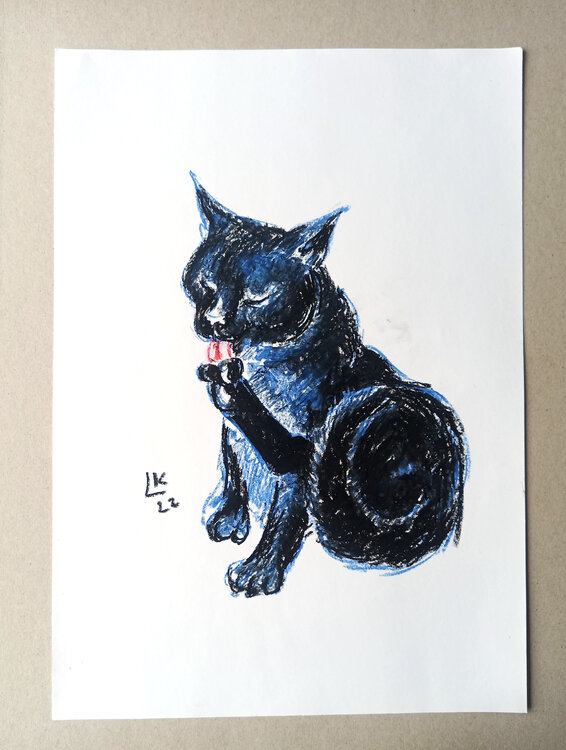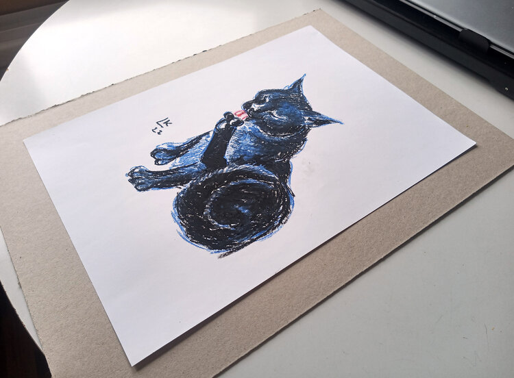 Gatto nero, animale domestico, gattino, animale, dipinto a pastello ad olio originale unico nel suo genere.