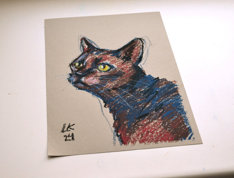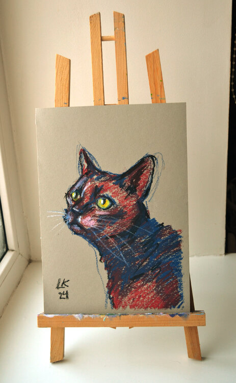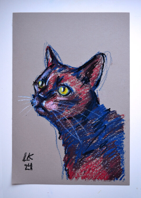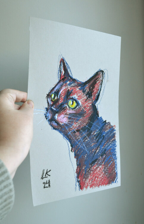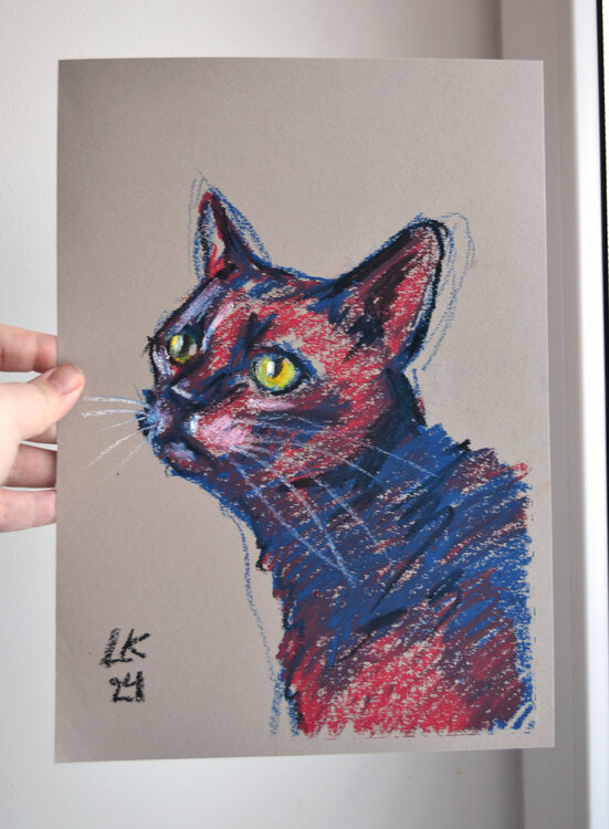 Questa opera d'arte unica e straordinaria è un ritratto di gatto nero unico nel suo genere, creato dall'artista Lada Kholosho. Il supporto utilizzato è carta e pastello a olio e il dipinto misura 30 cm di altezza e 21 cm di larghezza. Si tratta di un originale dipinto a mano, firmato dall'artista stessa, ed è perfetto per i collezionisti di arte contemporanea. Il dipinto presenta uno stile ultra contemporaneo e mostra un livello di dettaglio impressionante1
