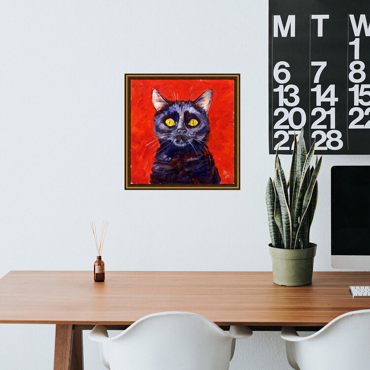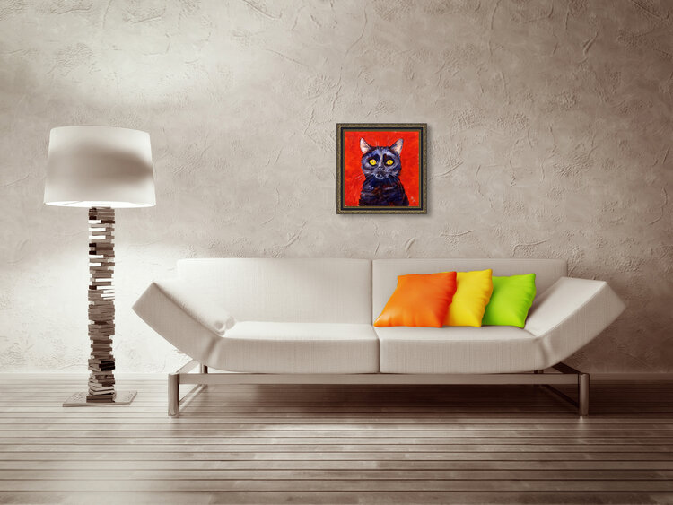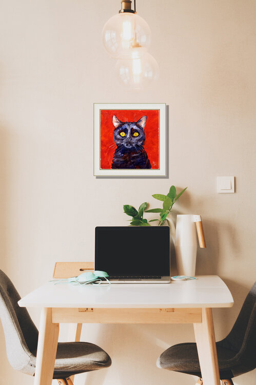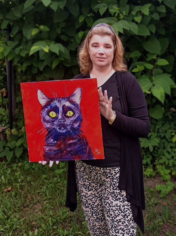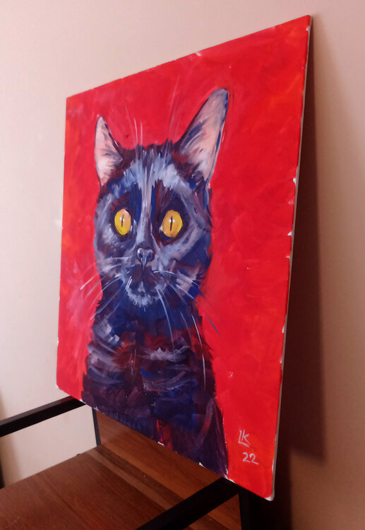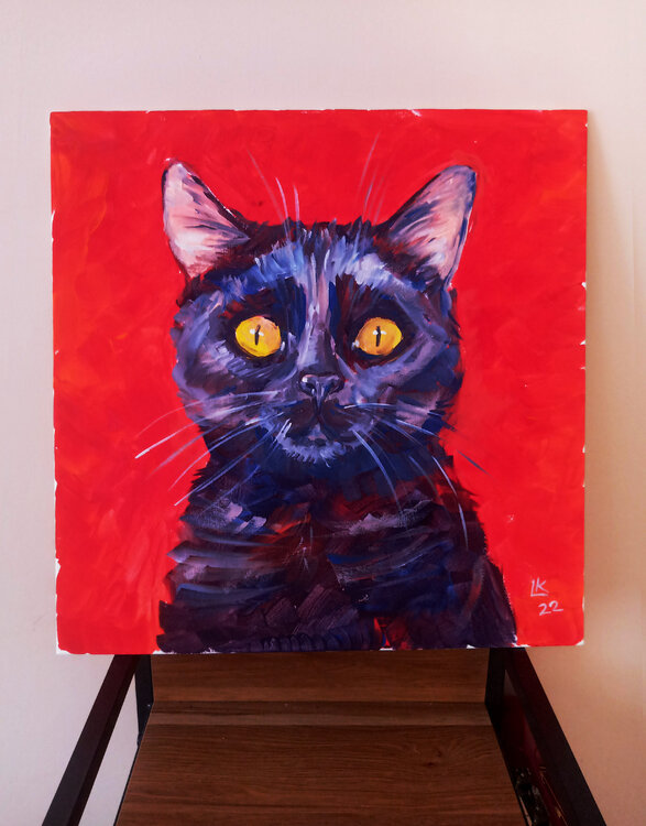 Questo dipinto è stato ispirato dal mio gatto nero Gaby, l'ho portato con me in Estonia dall'Ucraina. Avevamo viaggiato in autobus attraverso sei contee per raggiungere il punto finale. Il tragitto dall'Ucraina all'Estonia dura un'ora e mezza in aereo, ma a causa della guerra gli aerei non volano. Così abbiamo trascorso tre giorni per viaggiare sulla terra. Mi preoccupavo per la mia gatta che non aveva mai viaggiato prima, ma stava bene e aveva dormito1