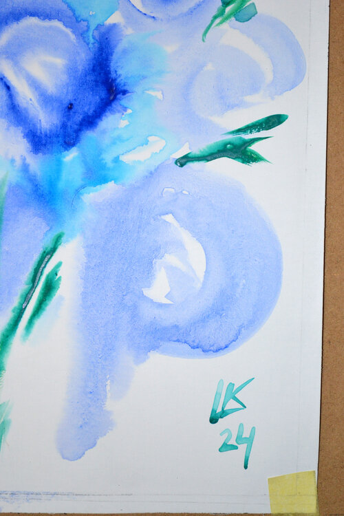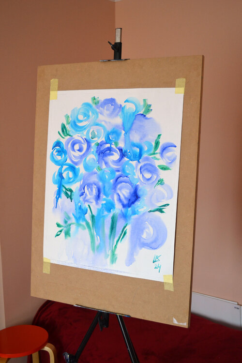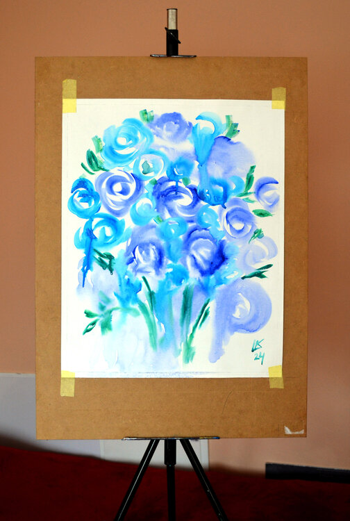Si tratta di un dipinto ad acquerello artigianale di medie dimensioni, intitolato "Blue Roses Bouquet", di Lada Kholosho. L'opera presenta un mazzo di fiori in una tavolozza di colori freddi, principalmente blu e verdi, ed è stata creata utilizzando tecniche di acquerello su tela. Il pezzo è unico nel suo genere.