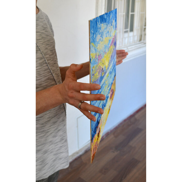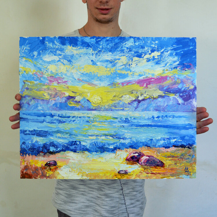 Questo è un dipinto a olio originale fatto a mano di Lada Kholosho intitolato "Colorful Sunset Artwork". Presenta uno stile contemporaneo ed espressionista con elementi di astratto e impressionismo. Il dipinto raffigura un paesaggio marino con un cielo strutturato e un paesaggio oceanico, mostrando un tramonto colorato. È firmato dall'artista e misura 16 pollici di altezza e 20 pollici di larghezza. Il dipinto è senza cornice e prodotto utilizzando1