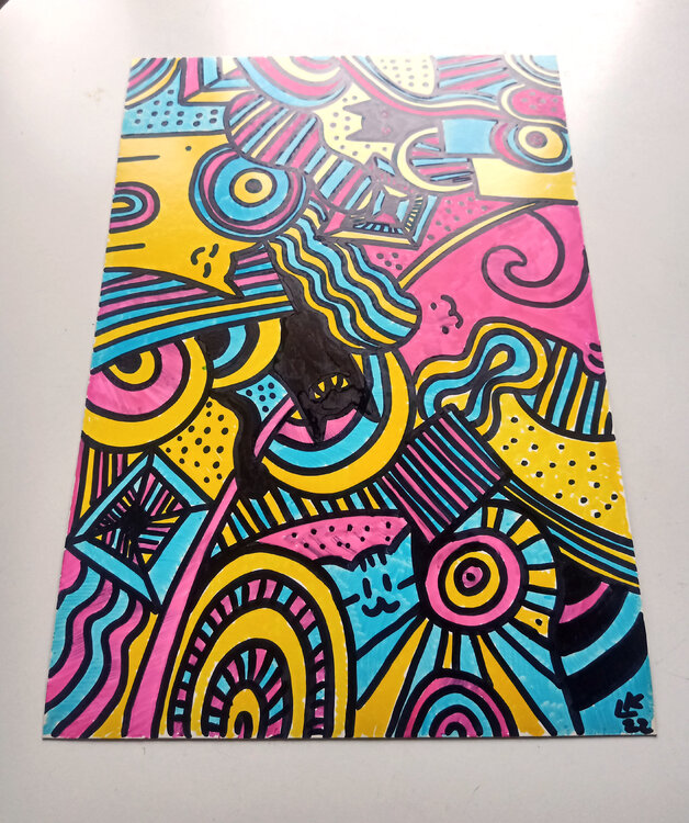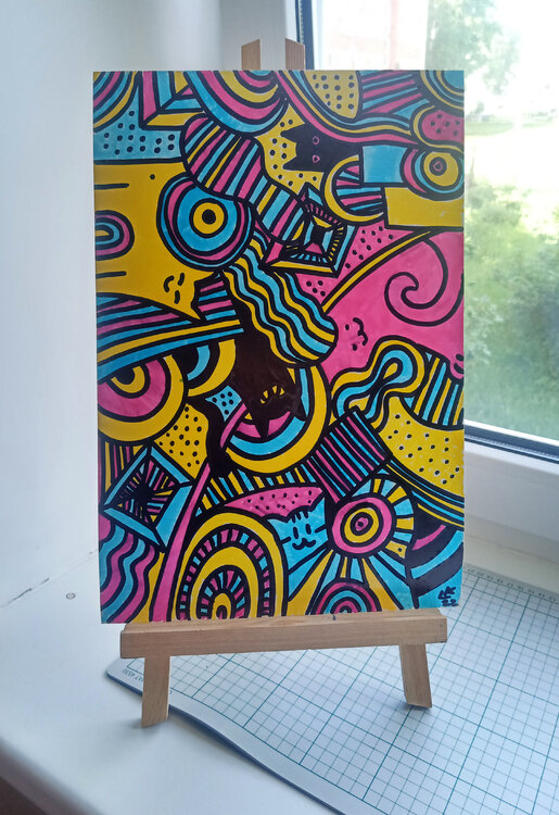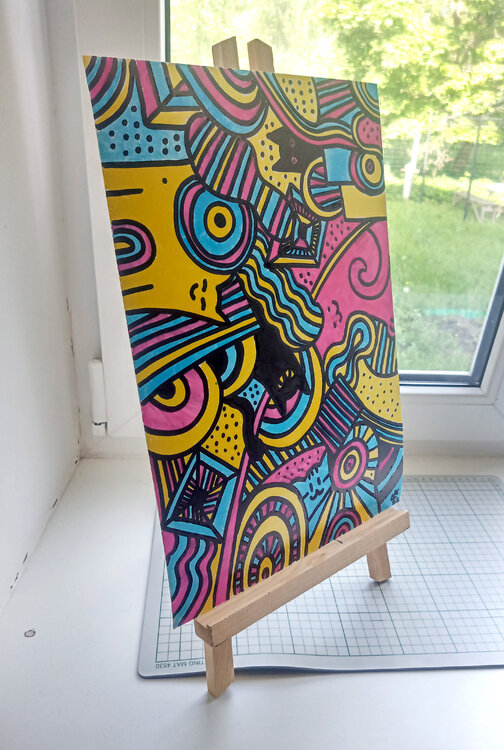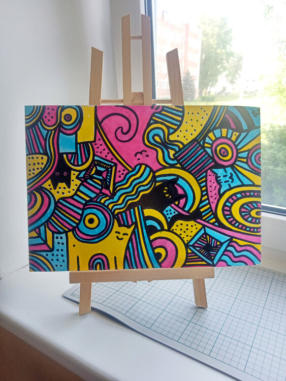 Trova cinque gatti in questa divertente immagine colorata. Un'opera d'arte astratta ricca di contrasti e dettagli che decorerà al meglio la tua parete. Subconscio astratto, doodle, doodleart, disegno, dipinto a mano, opere d'arte originali. Pittura unica nel suo genere, arredamento per la camera dei bambini, gatti, animali domestici, animali, puzzle.