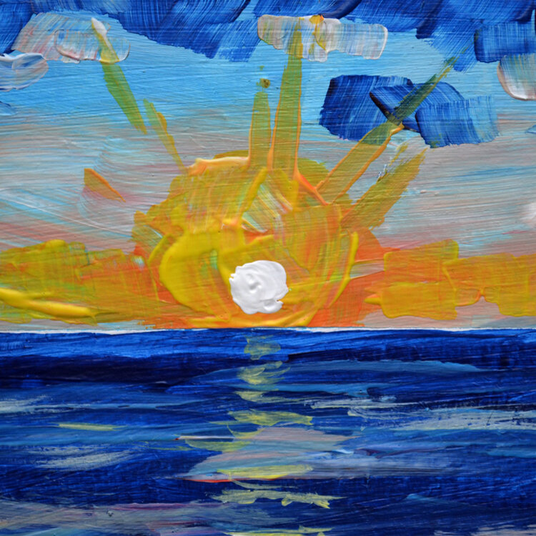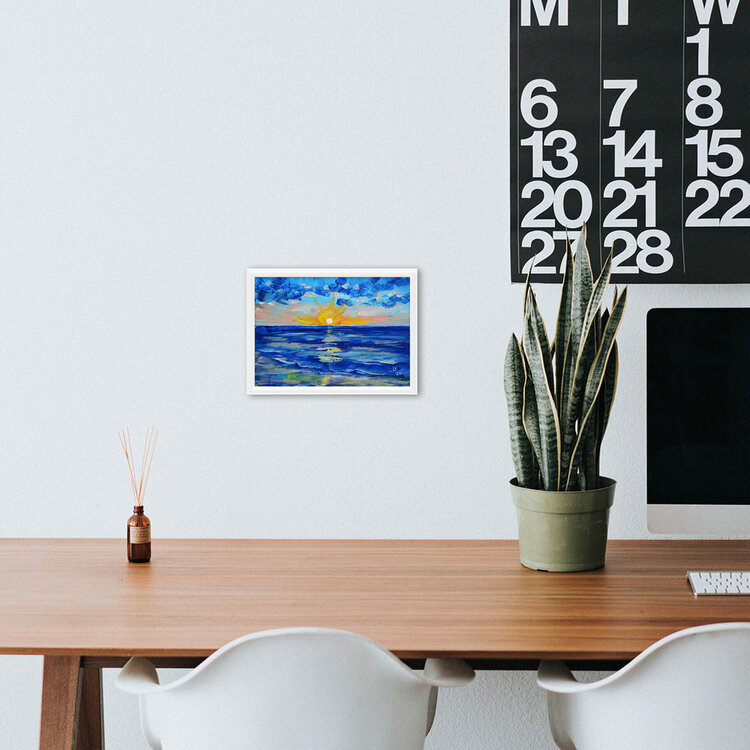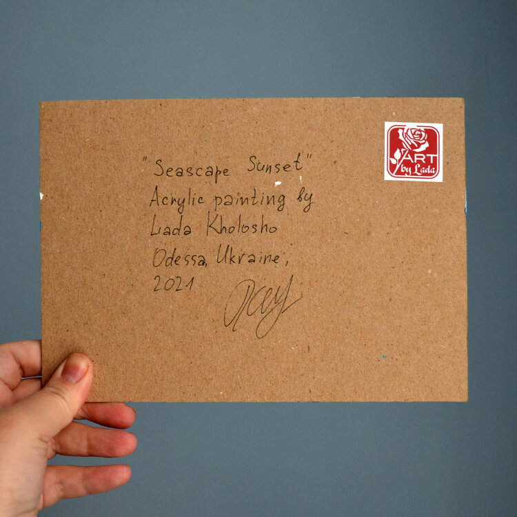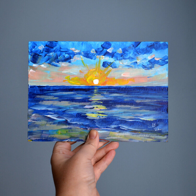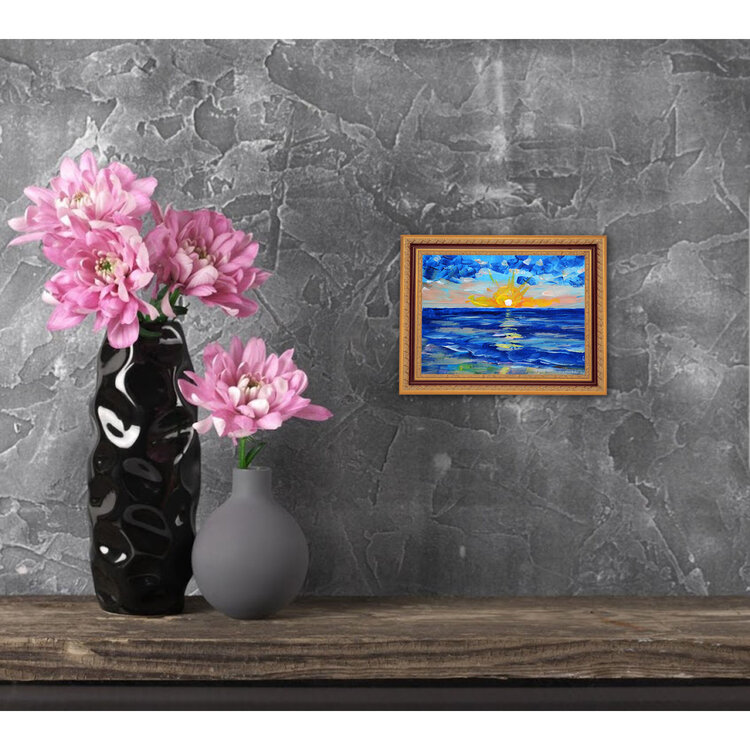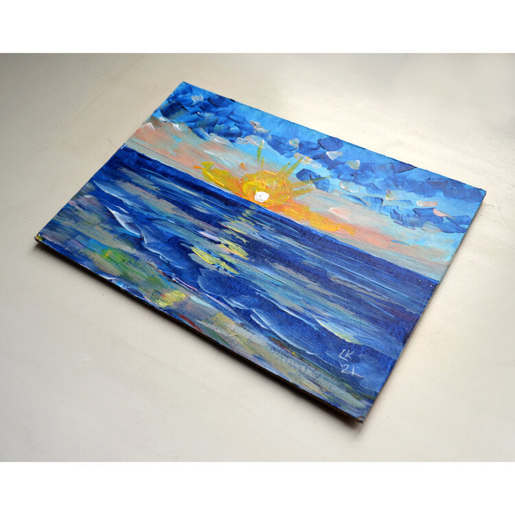 Bellissimo paesaggio marino astratto con pittura impressionista moderna al tramonto, piccolo paesaggio neutro, dipinto originale unico nel suo genere.