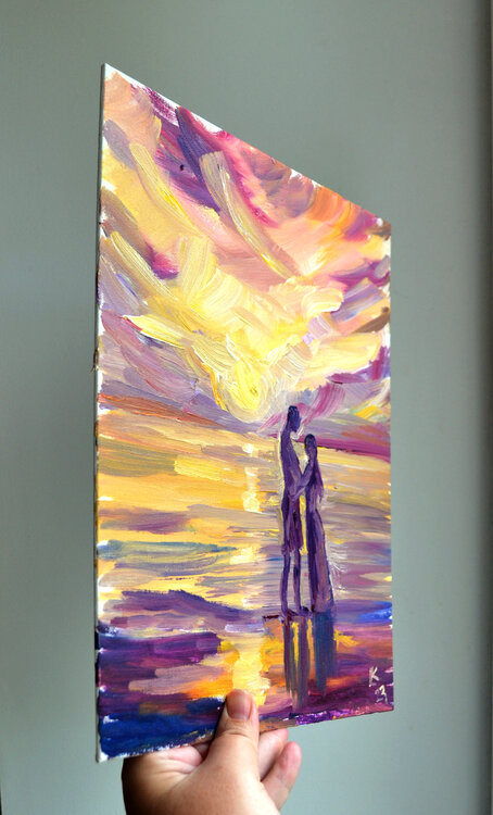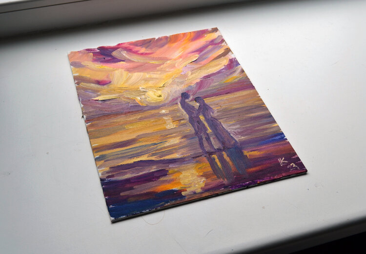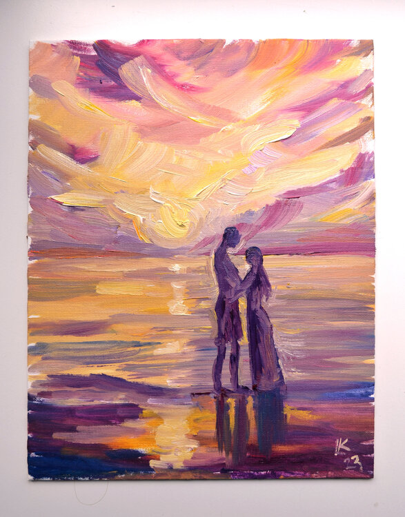 L'opera d'arte cattura un momento incantevole di una coppia affettuosa, in piedi insieme su una spiaggia tranquilla. Immersi nei toni caldi e dorati del sole al tramonto, i loro contorni sono elegantemente illuminati, creando un'atmosfera di vicinanza e serenità. Mentre il sole tramonta con grazia oltre l'orizzonte, la sua luce dolce e radiosa abbraccia la coppia, proiettando un sottile riflesso sulle onde serene che accarezzano la costa.