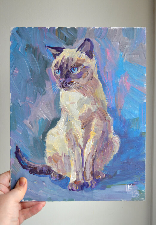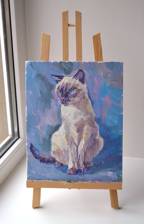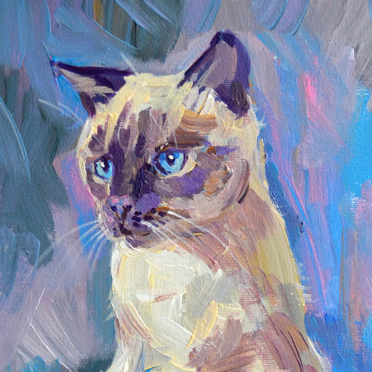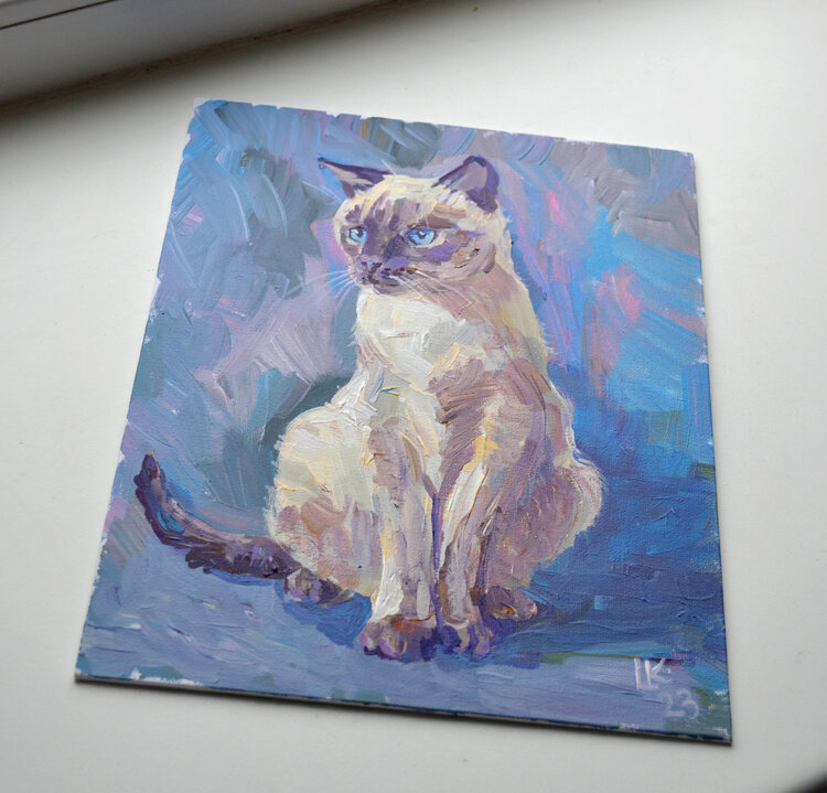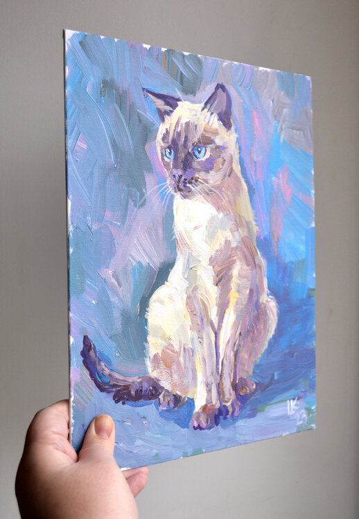 "Gatto siamese su sfondo blu" - dipinto acrilico originale su cartone telato. Dimensioni: 30 x 24 cm / 11,7 x 9,4"