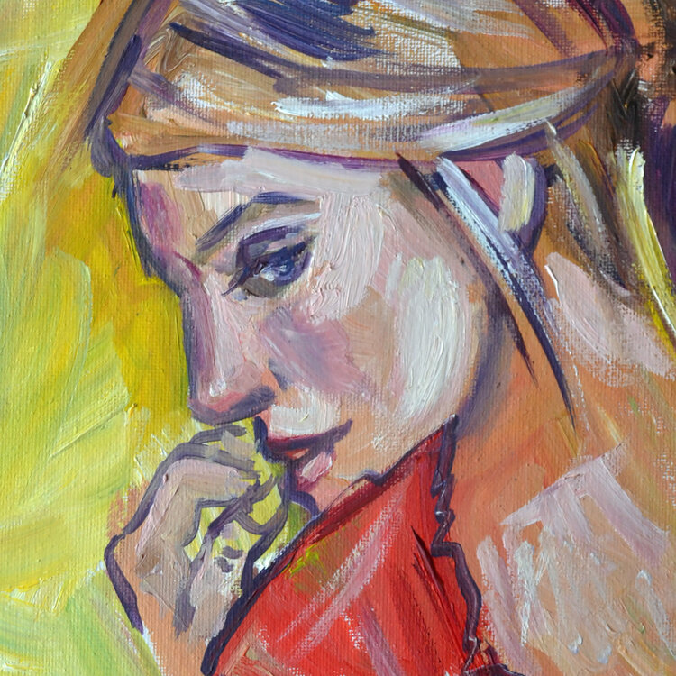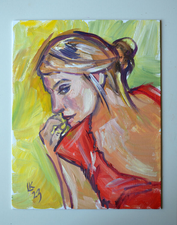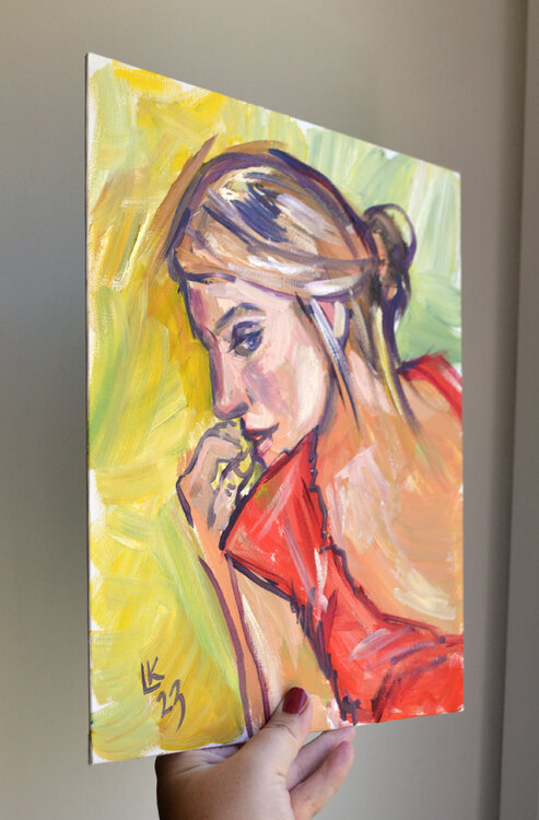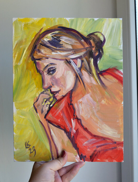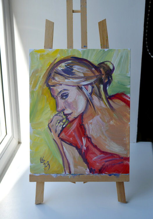 Ritratto di una donna in abito rosso. Questo dipinto originale è l'aggiunta perfetta all'arredamento della tua casa. Questo dipinto a olio (24x30 cm/9,5x12 pollici) è la soluzione ideale per coloro che cercano un'opera d'arte da parete conveniente senza compromettere la qualità. Quest'opera d'arte è stata dipinta a mano con colori ad olio di qualità artistica su un pannello di tela dall'artista Lada Kholosho. Colori vivaci e tratti espressivi dalla1