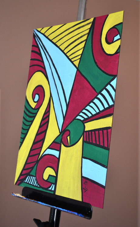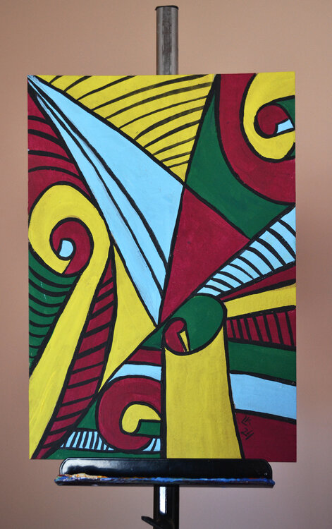 Si tratta di un dipinto moderno originale creato nel 2024. Caratterizzato da colori vivaci e audaci con motivi intrecciati dinamici, quest'opera d'arte misura 32x22 cm (12,5x9 pollici). Perfetto per aggiungere un tocco di colore e un tocco contemporaneo a qualsiasi spazio. Ideale per collezionisti d'arte e appassionati di arredamento moderno.