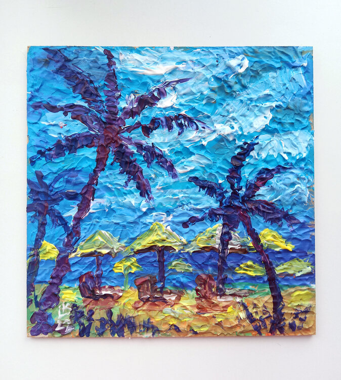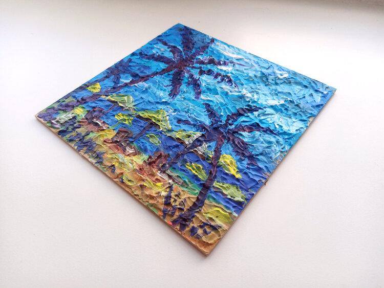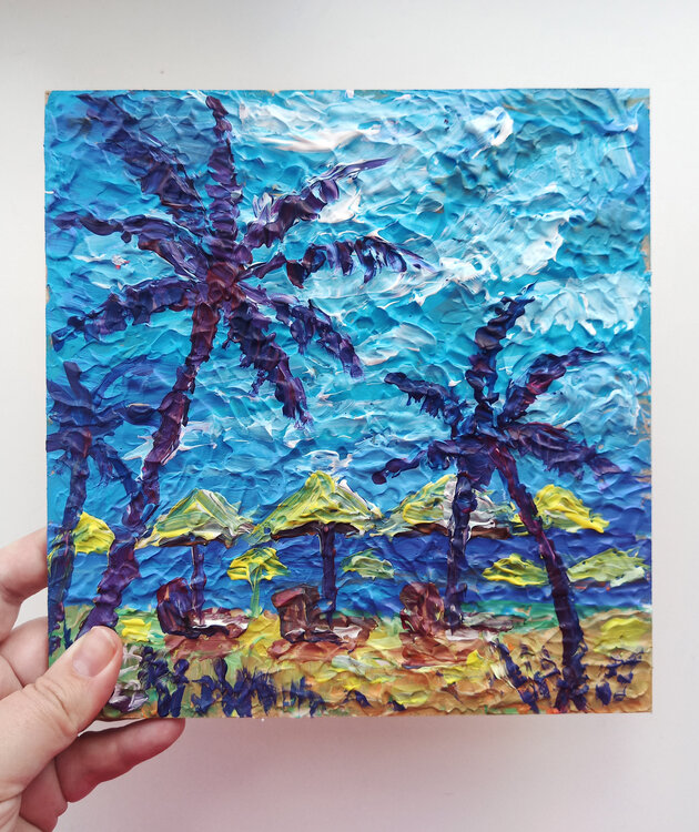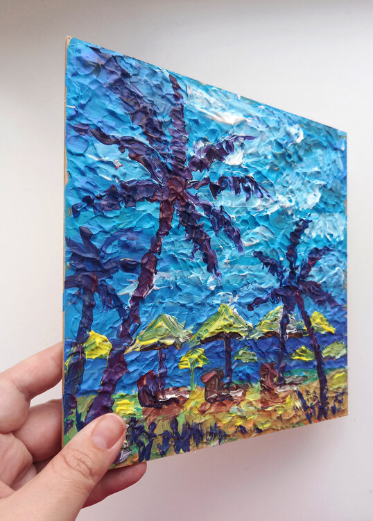 Paesaggio della palma, paesaggio marino, spiaggia, tramonto romantico, opera d'arte originale, dipinto originale unico nel suo genere.