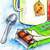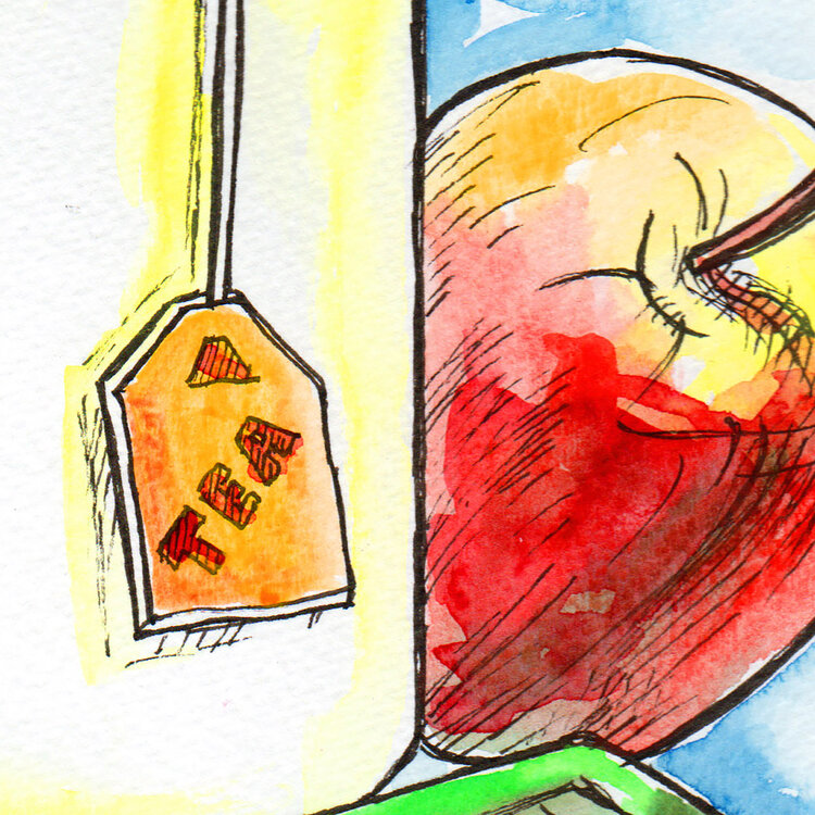 Tazza, tè, cucchiaino, cioccolato, mela, dolce, caldo, cucina, arte, buongiorno, dipinto originale unico nel suo genere.