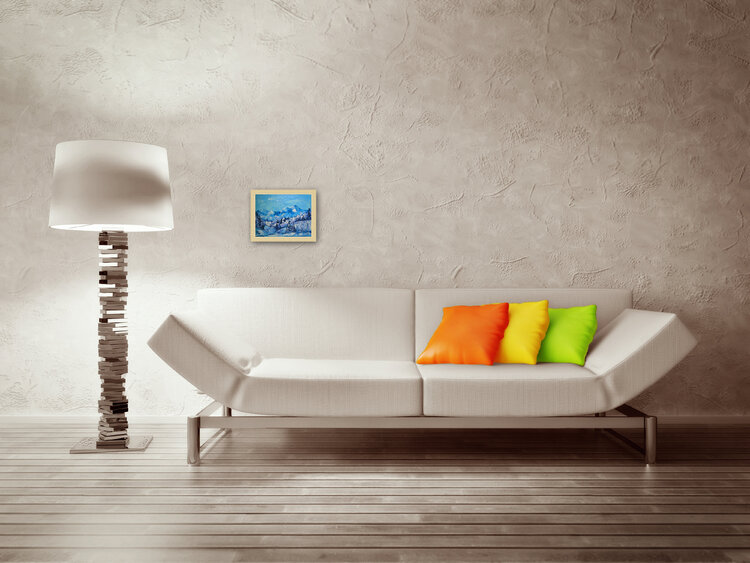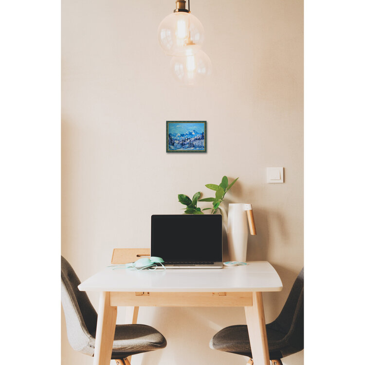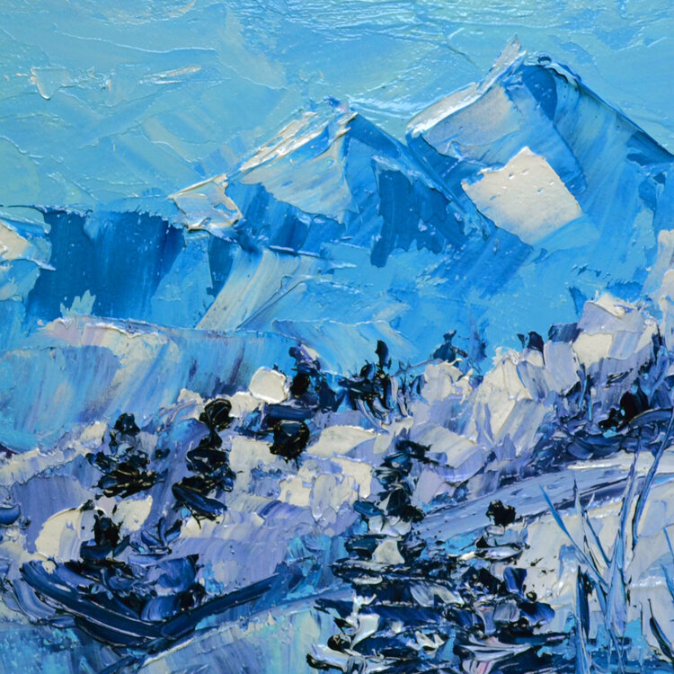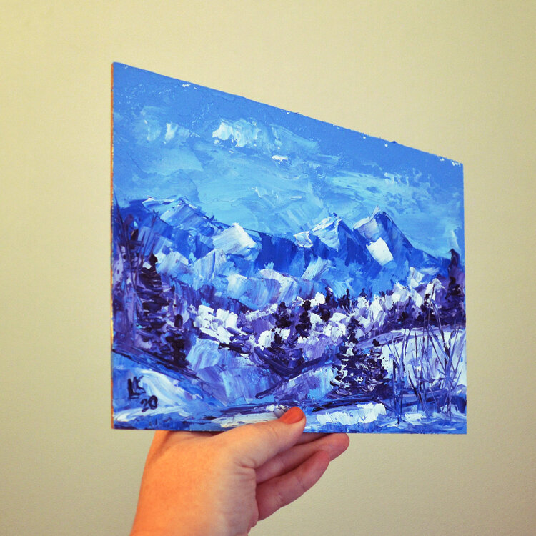 Montagne bianche. Paesaggio invernale. Vendo dipinto ad olio originale. Quadro moderno da parete, di piccole dimensioni, dipinto originale unico nel suo genere.