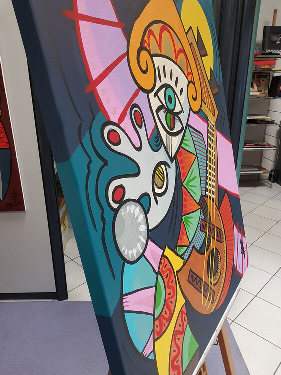 "Arlecchino, la chitarra e la Luna" racconta una storia. Una sera Arlecchino uscì di casa con la sua chitarra, deciso a cantare una serenata alla sua amata, la Luna: in un mondo di fantasia, perché accontentarsi di una persona quando si può amare la Luna? E così cantò per tutta la notte, finché ... il resto lo lascio a chi guarderà il mio quadro, e meglio ancora a chi lo porterà a casa, ad immaginare la storia d'amore fra Arlecchino e la Luna.