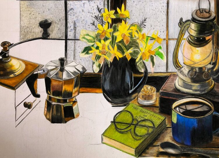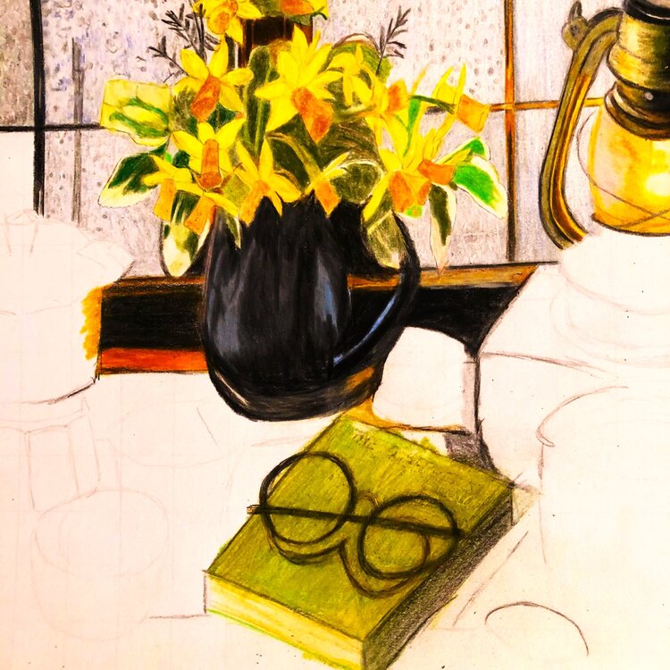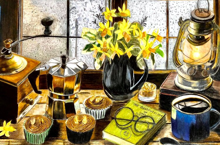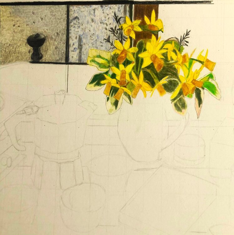 Tutti gli ingredienti sono lì per un piacevole momento del caffè. I narcisi portano allegria in questo dipinto.