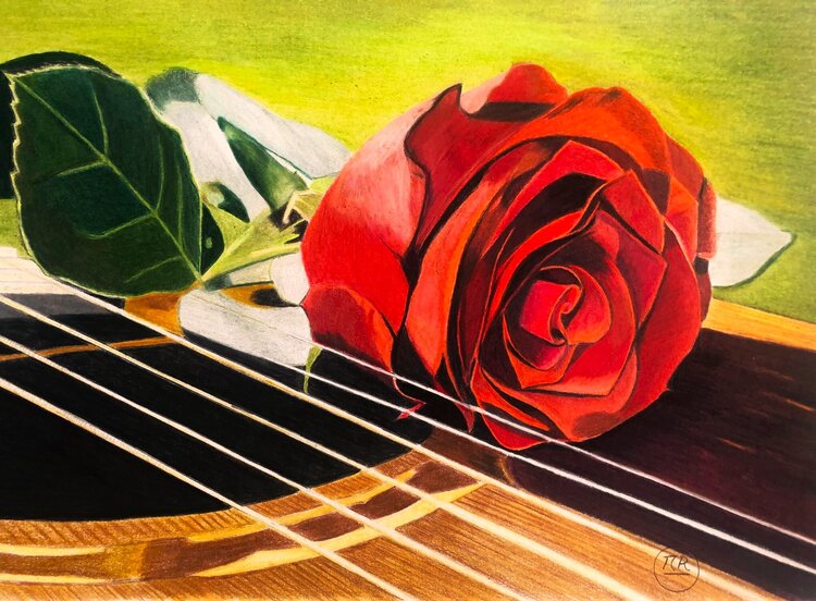 Rosa alla chitarra. Una rosa rossa e una romantica serenata alla chitarra possono riempire una donna... Disegnare con matite colorate su foglio A3.
