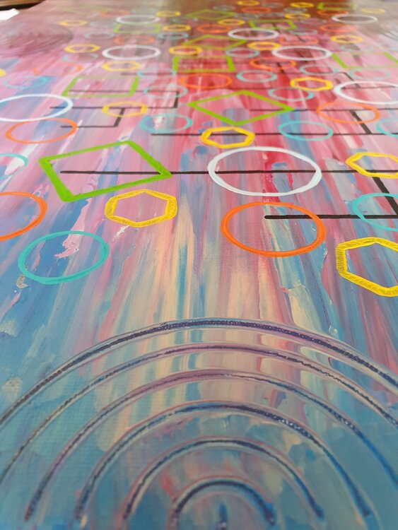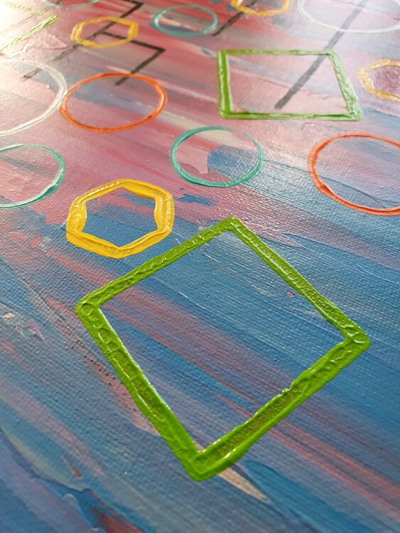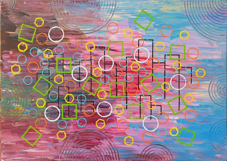 La Città stilizzata pare essere appesantita da innumerevoli forme che rappresentano i pensieri di coloro che la abitano e che la desiderano diversa... magari più colorata o forse più accogliente.