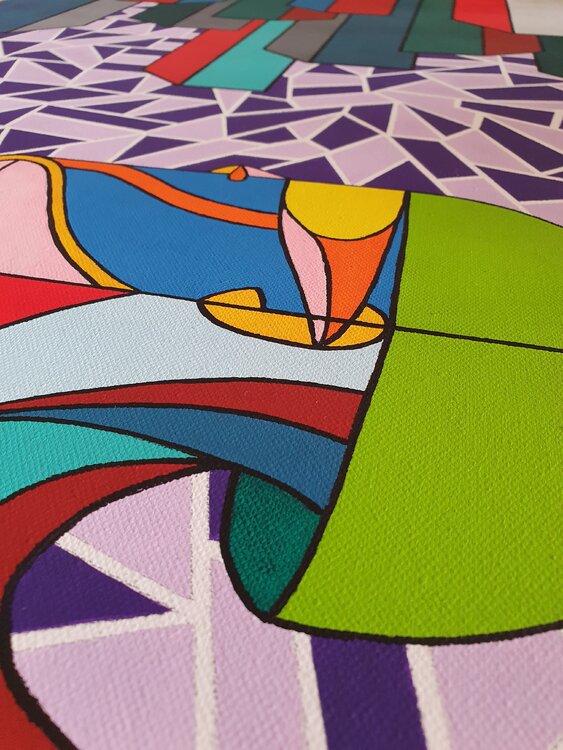 La tela rappresenta una società moderna al di sopra della quale vi è un'entità che la osserva: osserva la crescita, evoluzione e, l'imminente, distruzione. Lo sfondo è geometrico e spezzettato a simboleggiare quasi uno specchio infranto in quanto dai vari frammenti è possibile osservare un diverso riflesso.