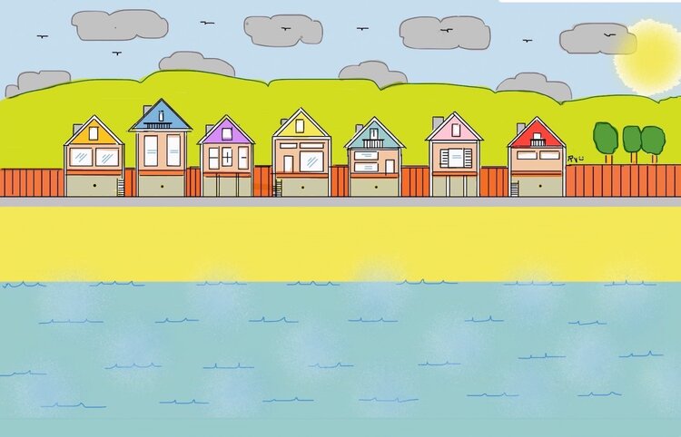 Casa sulla spiaggia colorata disegnata con la bocca del topo (Dimensioni tela 20 x 30 cm)