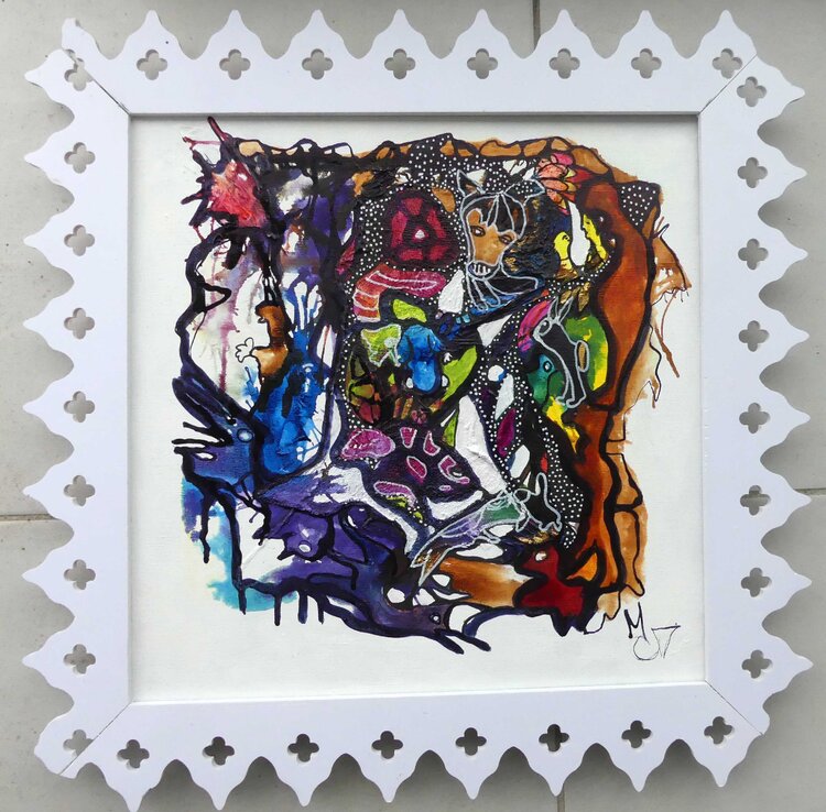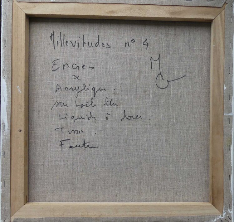 Su uno sfondo preparato, le gocce d'inchiostro formano un disegno imprevedibile, riorganizzato dall'artista, che fa emergere una moltitudine di personaggi.
